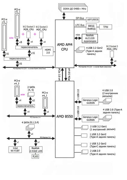 Плюс 14 линий PCIe, выделенные на поддержку иной периферии (включая те же самые контроллеры USB). Итого, у B550 в данном случае реализованы почти все его возможные порты.