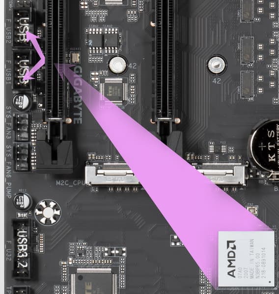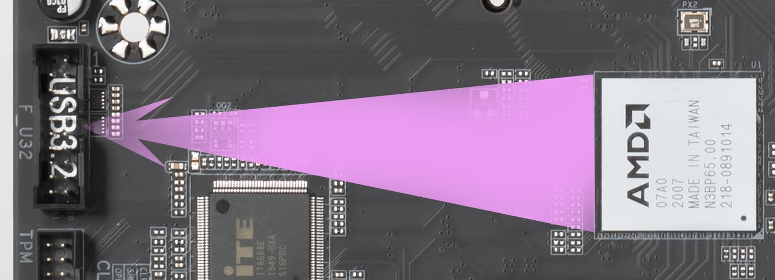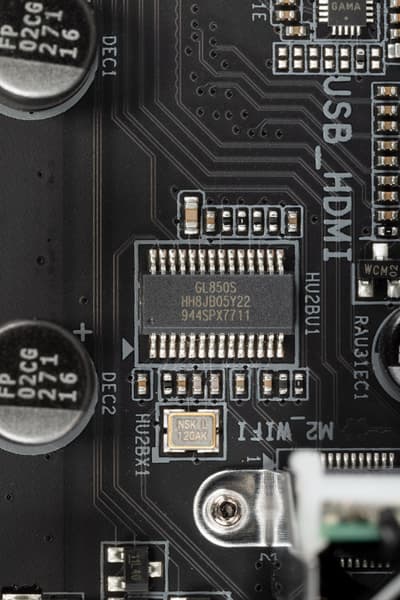 - 10 портов USB 2.0/1.1: 4 реализованы через контроллер Genesys Logic GL850S (его тщательно «запихнули» прямо почти под слот PCI-e (на него потрачен 1 порт USB 2.0 от B550) и представлены двумя внутренними разъемами (каждый на 2 порта); еще 4 реализованы через другой контроллер Genesys Logic GL850S (на него потрачен 1 порт USB 2.0 от B550) и представлены портами Type-A на задней панели (черные); еще 2 реализованы через B550 и также представлены портами Type-A на задней панели (черные).