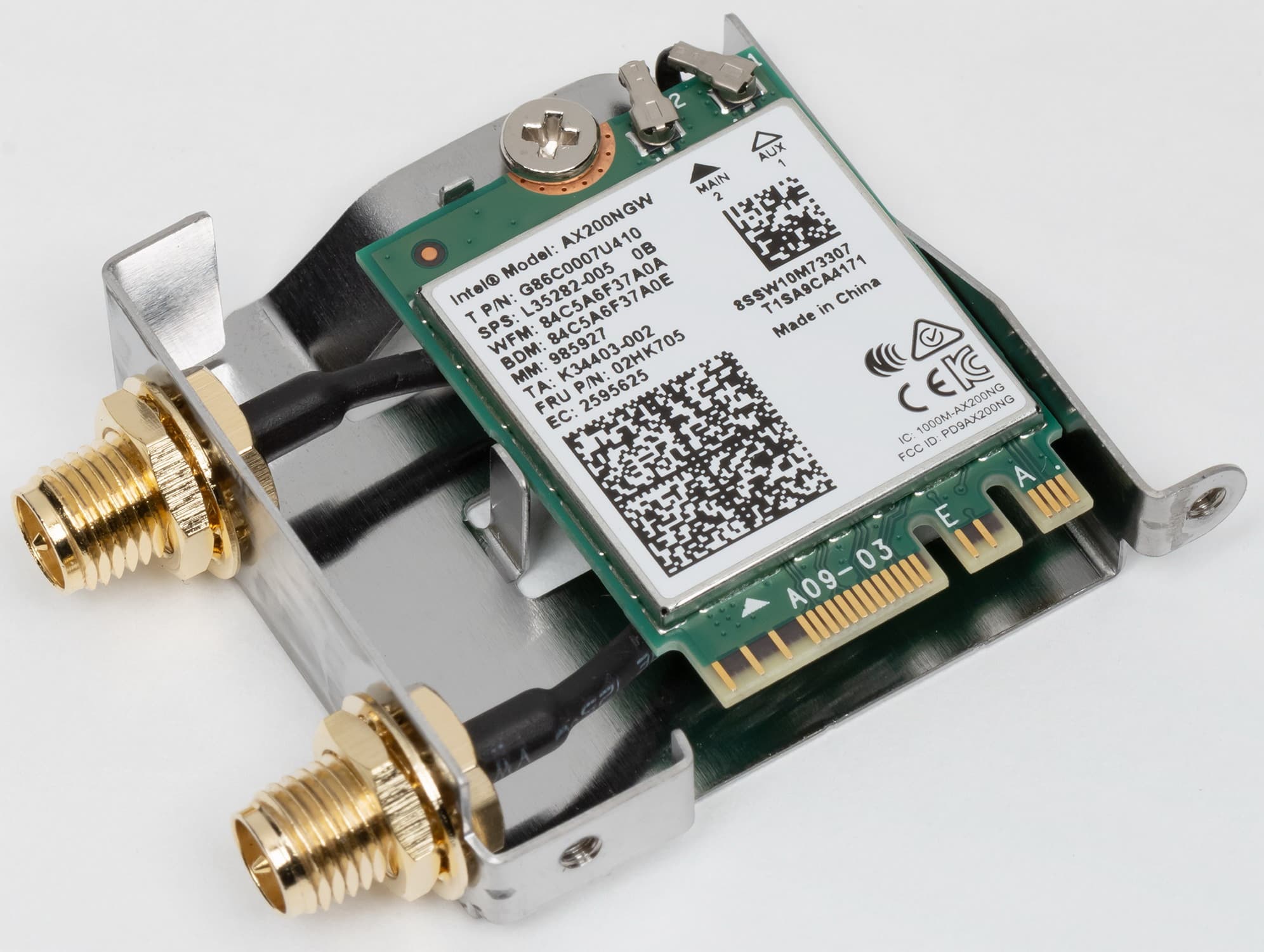 Имеется и комплексный беспроводной адаптер на контроллере Intel AX200NGW, через который реализованы Wi-Fi (802.11a/b/g/n/ac/ax) и Bluetooth 5.0. Он установлен в слот M.2 (E-key), и его разъемы для привинчивания выносных антенн выведены на заднюю панель.