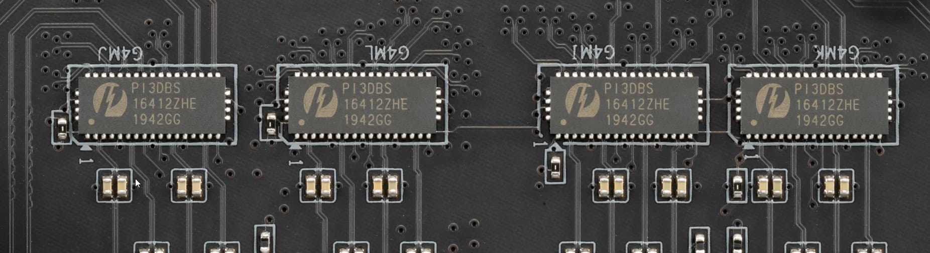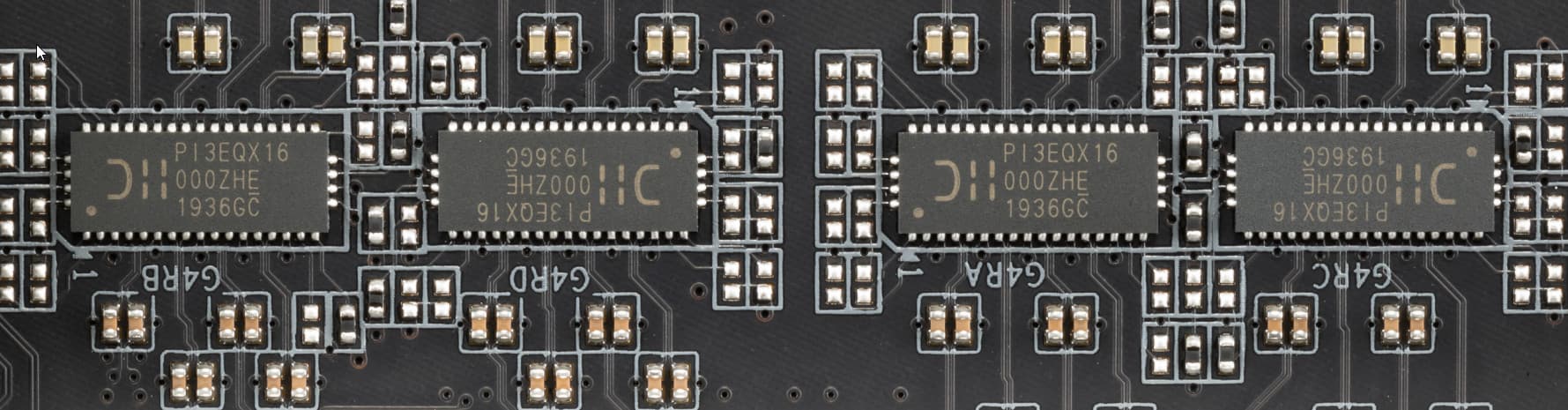 У данной платы имеется распределение линий PCIe между слотом PCIe x16 и портами M.2, поэтому востребованы мультиплексоры PI3DBS от Pericom.
