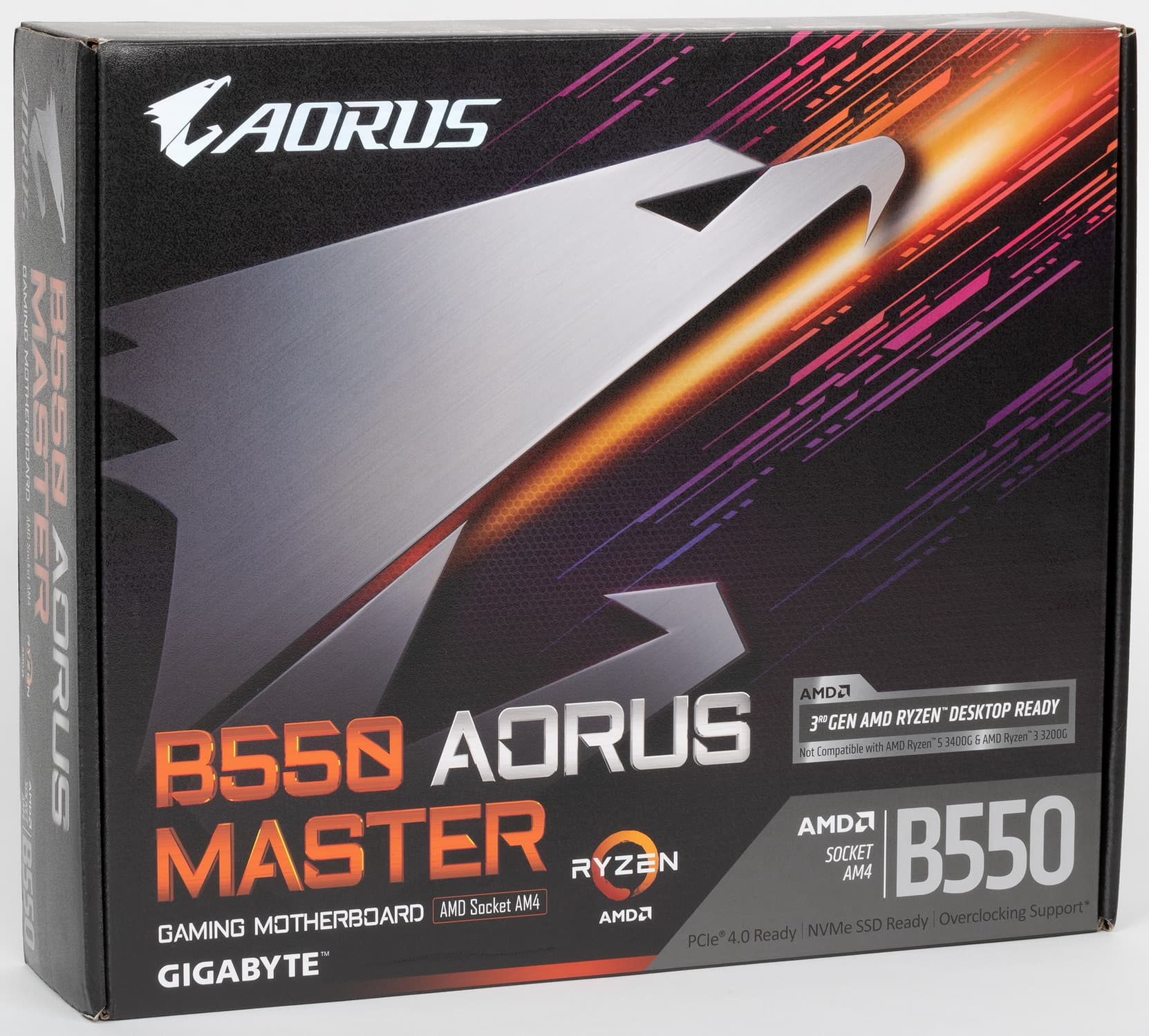 Gigabyte B550 Aorus Master поставляется в стандартной картонной коробке с фирменным дизайном Aorus (логотип Gigabyte также присутствует, так что пока бренд Aorus тесно связан с Gigabyte).