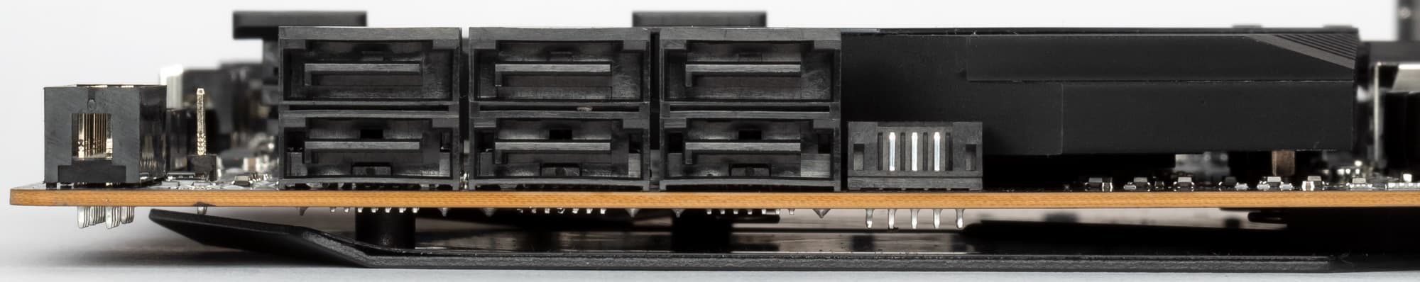 Всего у платы 6 разъемов Serial ATA 6 Гбит/с + 3 слота для накопителей в форм-факторе M.2. (Еще один слот M.2, спрятанный под кожухом блока разъемов задней панели, занят контроллером беспроводных сетей Wi-Fi/Bluetooth.). 6 портов SATA реализованы через чипсет B550 и поддерживают создание RAID.