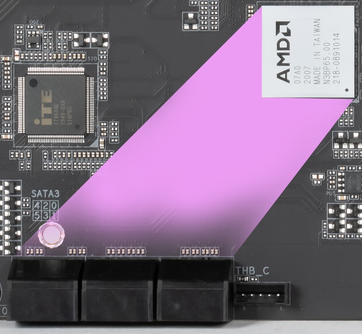 Теперь посмотрим выше на то, как работают процессоры в данной конфигурации. У всех CPU этого плана всего 20 линий PCIe (плюс 4 линии на даунлинк с чипсетом). И теперь стоит обратить внимание на уникальность конфигурации у данной платы: даже на диаграмме видно, что «багаж» периферии как-то чуть переместился в область CPU. Обычно же мы привыкли, что у матплат всегда два слота PCIe x16 (_1 и _2) плюс слот M.2_1. А вот здесь один слот PCI-e x16! Но зато имеется аж три слота M.2 и все они (внимание!) подключены к процессору! То есть все три M.2 могут работать с интерфейсом PCI-e 4.0! Но при этом поддерживается работа только одной видеокарты! Также в процессорах Ryzen имеется контроллер High Definition Audio (HDA), связь с аудиокодеком идет путем эмуляции PCI шины (есть ограничение на звук по схеме 7.1: до 32-бит/192 кГц).