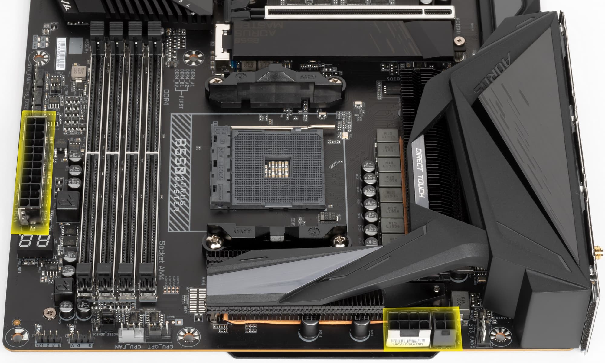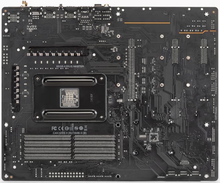Форм-фактор ATX имеет размеры до 305×244 мм, а E-ATX — до 305×330 мм. Материнская плата Gigabyte B550 Aorus Master имеет размеры 305×244 мм, поэтому выполнена в форм-факторе ATX, и на ней имеются 9 монтажных отверстий для установки в корпус.