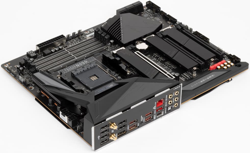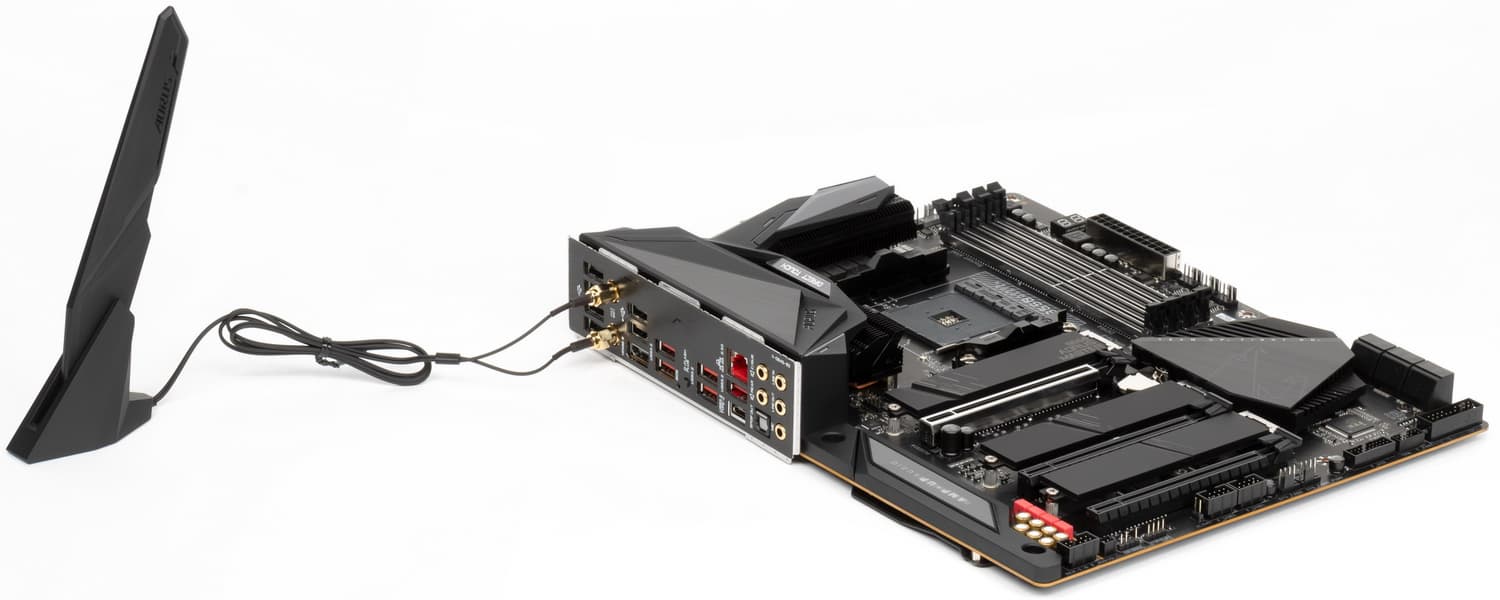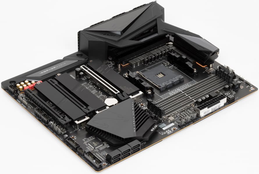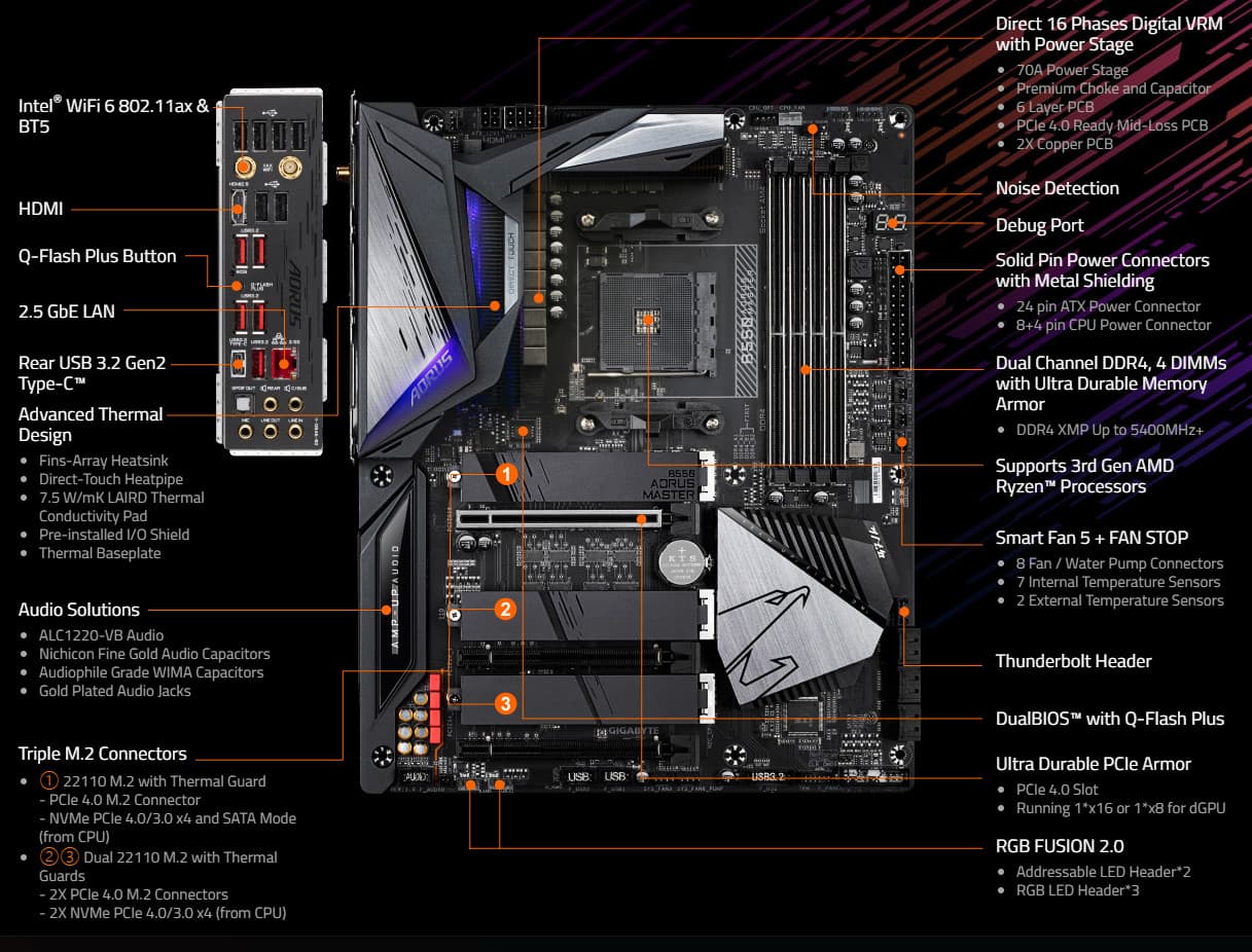 Gigabyte B550 Aorus Master — материнская плата на среднебюджетном чипсете, однако представленная под топовым брендом Aorus и недешевая (в районе 25 тысяч рублей). Функциональность у модели очень хорошая: 18 портов USB разных видов (включая 6 самых быстрых на сегодня), 6 портов SATA, проводной 2,5-гигабитный сетевой контроллер и беспроводной Wi-Fi 802.11ac + Bluetooth 5.0. А самое главное — уникальный набор слотов M.2. Здесь не привычные для среднебюджетных плат два слота, а три, и все подключены напрямую к процессору, а значит, при установке Ryzen 3000 они получат все преимущества шины PCIe 4.0. Однако процессоры Ryzen имеют только 20 свободных высокоскоростных портов, и 16 из них приходится на слоты PCIe и M.2, поэтому у рассматриваемой платы только один слот PCIe x16, да и тот вынужден делить ресурсы с двумя M.2. Тем не менее, плата имеет два слота PCIe x4 для карт расширения (правда, и здесь не обошлось без разделения ресурсов). Система питания процессора способна обеспечить работу любых совместимых процессоров в турборежиме. Плата имеет 8 разъемов для подключения вентиляторов и помп, радиаторами оснащены все накопители в слотах M.2. Стоит отметить подсветку, включая широкие возможности для подключения дополнительных RGB-устройств.