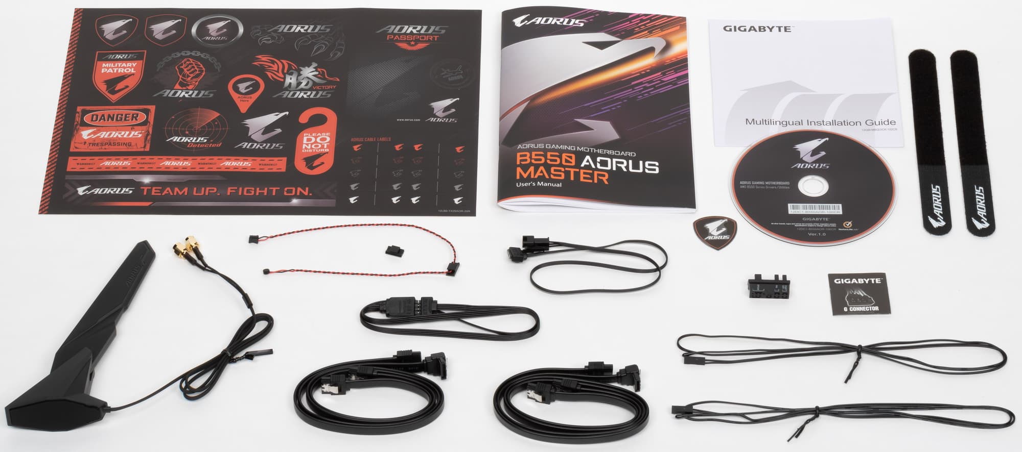 Комплект поставки традиционен для серии Master. Кроме традиционных элементов типа руководства пользователя и кабелей SATA, имеются: выносная антенна с подставкой для беспроводных соединений, разветвители для подключения подсветок, два термодатчика, датчик шума, винтики для монтажа модулей M.2, накопитель типа CD c ПО, фирменный адаптер G-connector, бонусные стикеры, стяжки и наклейки.