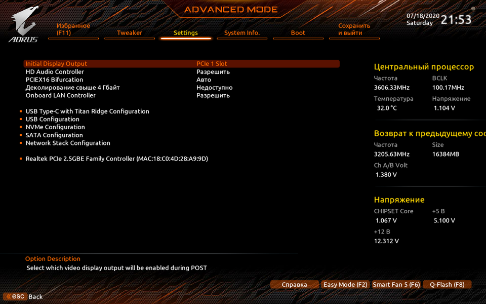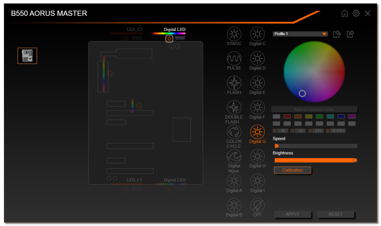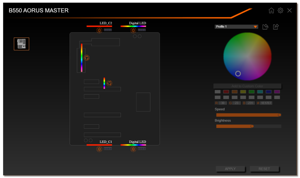 Все платы Gigabyte из семейства Aorus оснащаются красивой подсветкой. В данном случае эффекты подсветки создаются на кожухе над задним блоком портов (ну да, более скромно, чем у флагманских решений). Так же мы помним про 4 разъема для подключения внешней подсветки, и всем этим можно управлять через программу RGB Fusion.