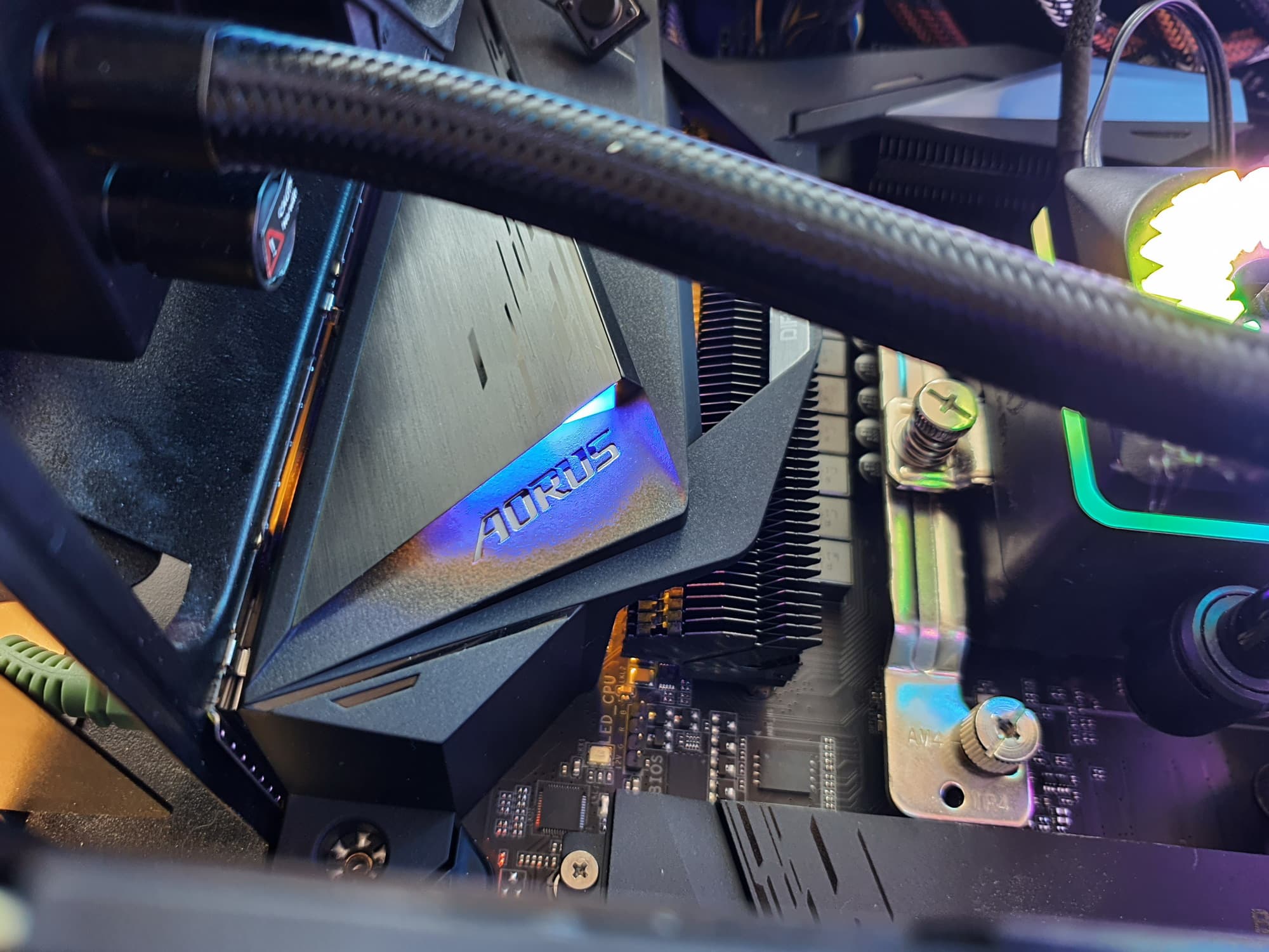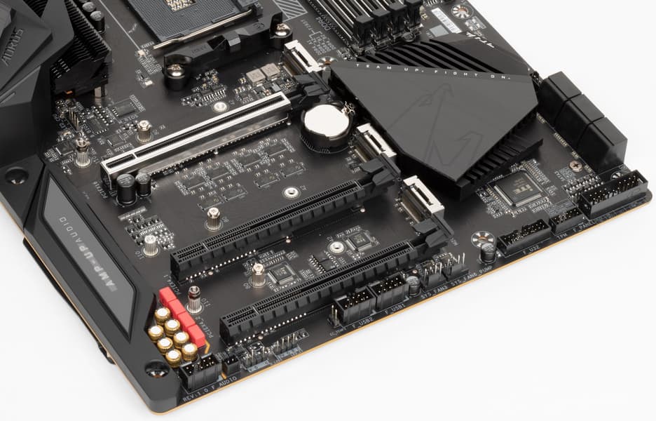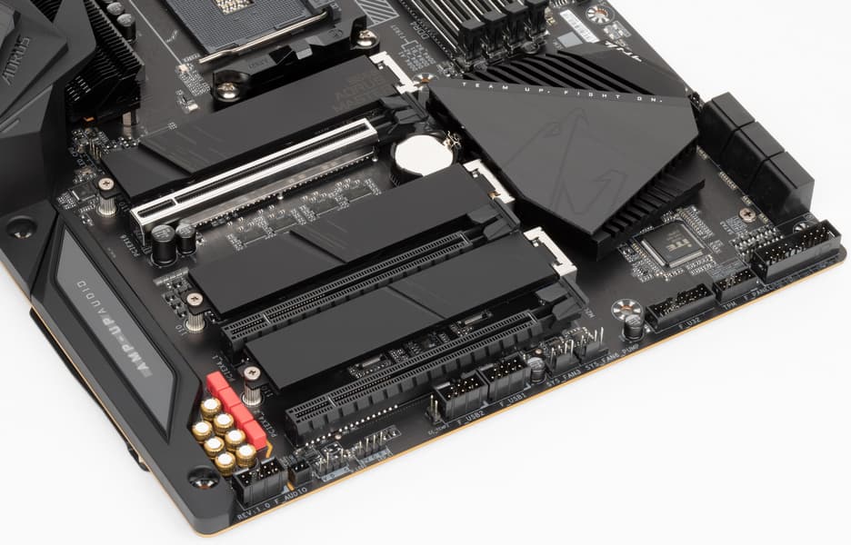 Слоты DIMM имеют металлическую окантовку, которая препятствует деформации слотов и печатной платы при установке модулей памяти и защищает от электромагнитных помех, и которая обычно всегда является составной частью именно флагманских материнских плат (ну, в принципе, учитывая, что линейка Aorus все же топовая, то присутствие этой особенности тут — логично).