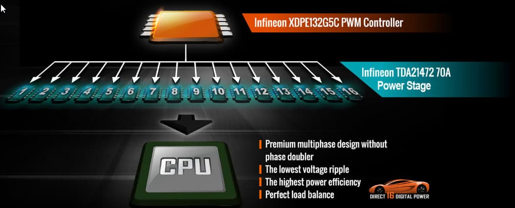 Управляет фазами ШИМ-контроллер XDPE132 от Infineon. Собственно, на 16 фаз он и рассчитан (дорогой процессор, да).