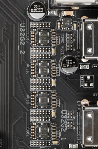Итак, через чипсет B550 реализовано 2 USB 3.2 Gen1 + 2 USB 3.2 Gen2 = 4 выделенных скоростных порта. Плюс 2 контроллера Genesys Logic GL850S имеют связь с B550 через 2 линии USB 2.0.