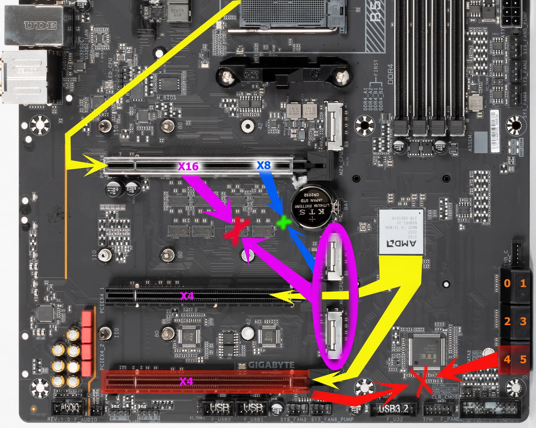 Ниже полная схема распределения ресурсов по слотам PCI-e