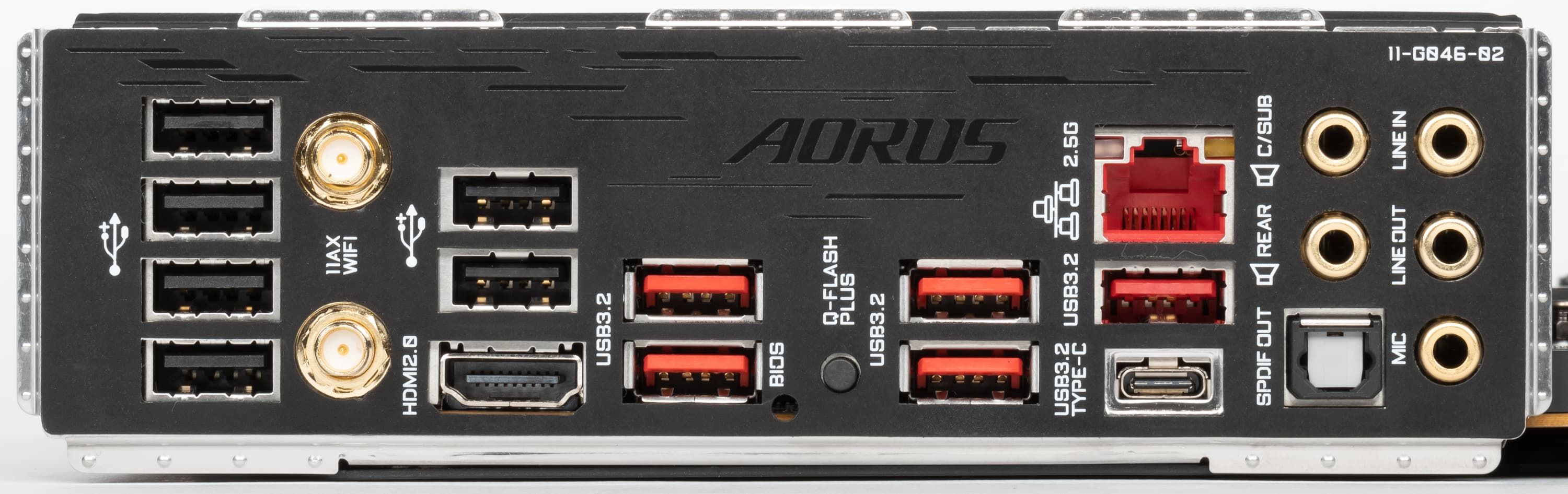 | Разъемы на задней панели | 1 × USB 3.2 Gen2 (Type-C) 5 × USB 3.2 Gen2 (Type-A) 6 × USB 2.0 (Type-A) 1 × RJ-45 5 аудиоразъемов типа миниджек 1 × S/PDIF 1 × HDMI 2 антенных разъема 1 кнопка перепрошивки BIOS — Flashback |