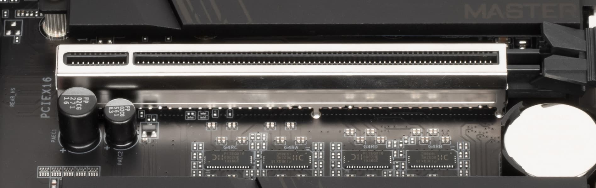 Как и слоты для памяти, слот PCIe x16 имеет металлическое армирование из нержавеющей стали, которое увеличивает его надежность (что может быть важным в случае довольно частой смены видеокарт, но что более важно: такой слот легче выдержит нагрузку на изгиб в случае установки очень тяжелой видеокарты топового уровня). Кроме того, такая защита предохраняет слот от электромагнитных помех.