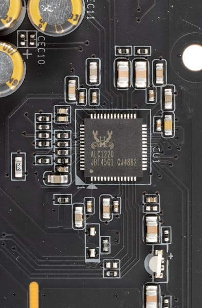 Как и во всех современных материнских платах звуком заведует аудиокодек Realtek ALC1220 (он и в данном случае есть — версия VB). Он обеспечивает вывод звука по схемам до 7.1.