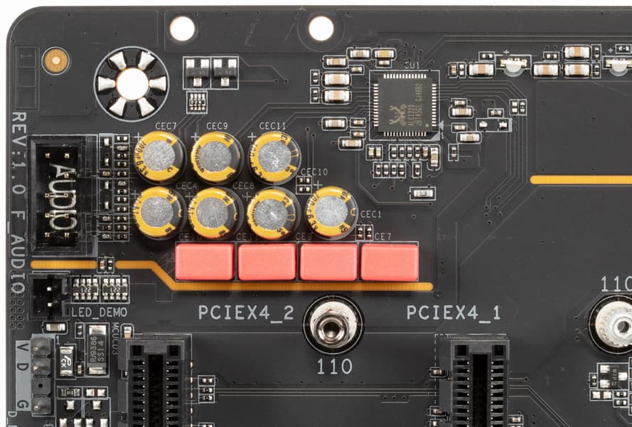 Аудиотракт не имеет ни операционных усилителей, ни ЦАП. В аудиоцепях платы применяются «аудиофильские» конденсаторы Nichicon Fine Gold.