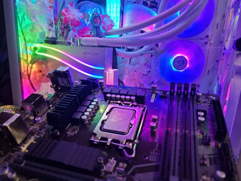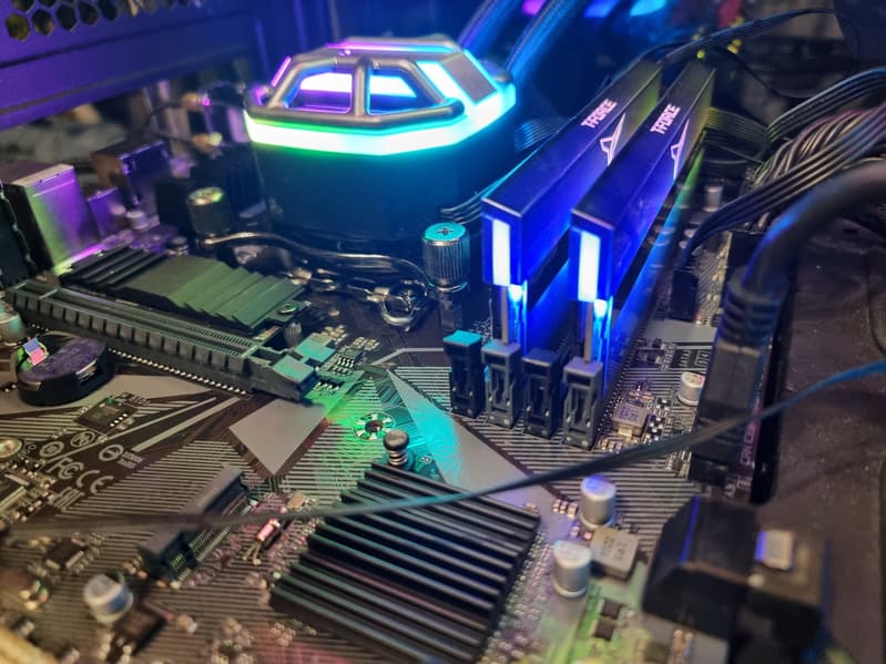 Еще у этой модели 4 порта SATA и 4 разъема для вентиляторов. Система питания процессора сама по себе умеренно мощная для продукта на бюджетном чипсете, потенциально она способна обеспечить работу любых совместимых процессоров с некоторым запасом на разгон. Сетевые возможности включают быстрый проводной контроллер 2,5 Гбит/с и беспроводной контроллер Wi-Fi 6E/Bluetooth 5.2. В числе других плюсов можно упомянуть возможность подключения RGB-устройств подсветки.
