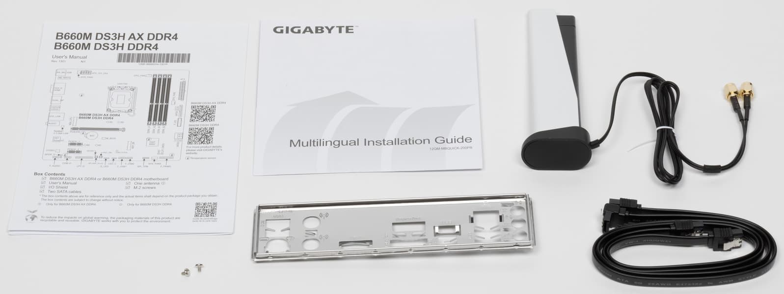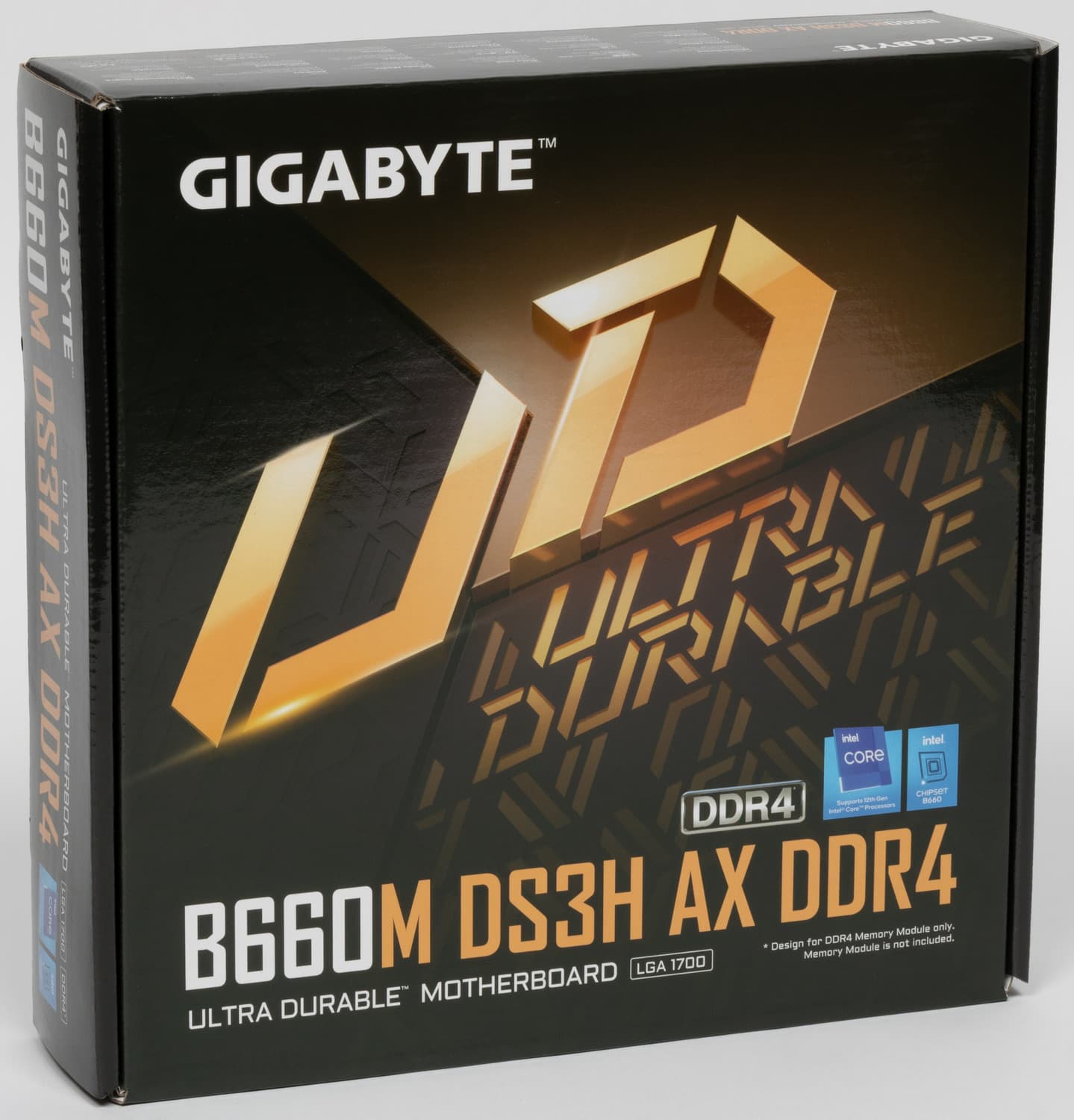 Gigabyte B660M DS3H AX DDR4 поставляется в стандартной коробке. Комплект размещен под платой в отдельном отсеке.