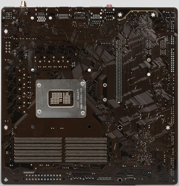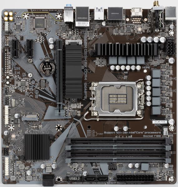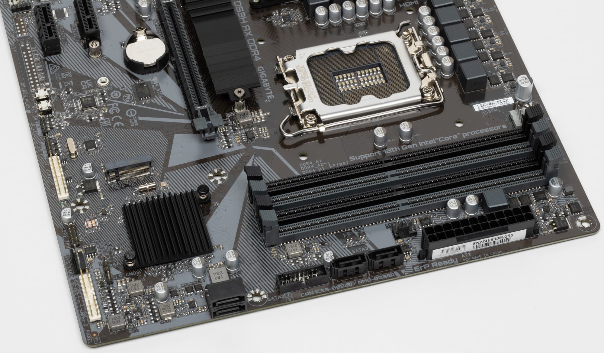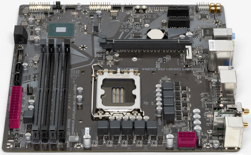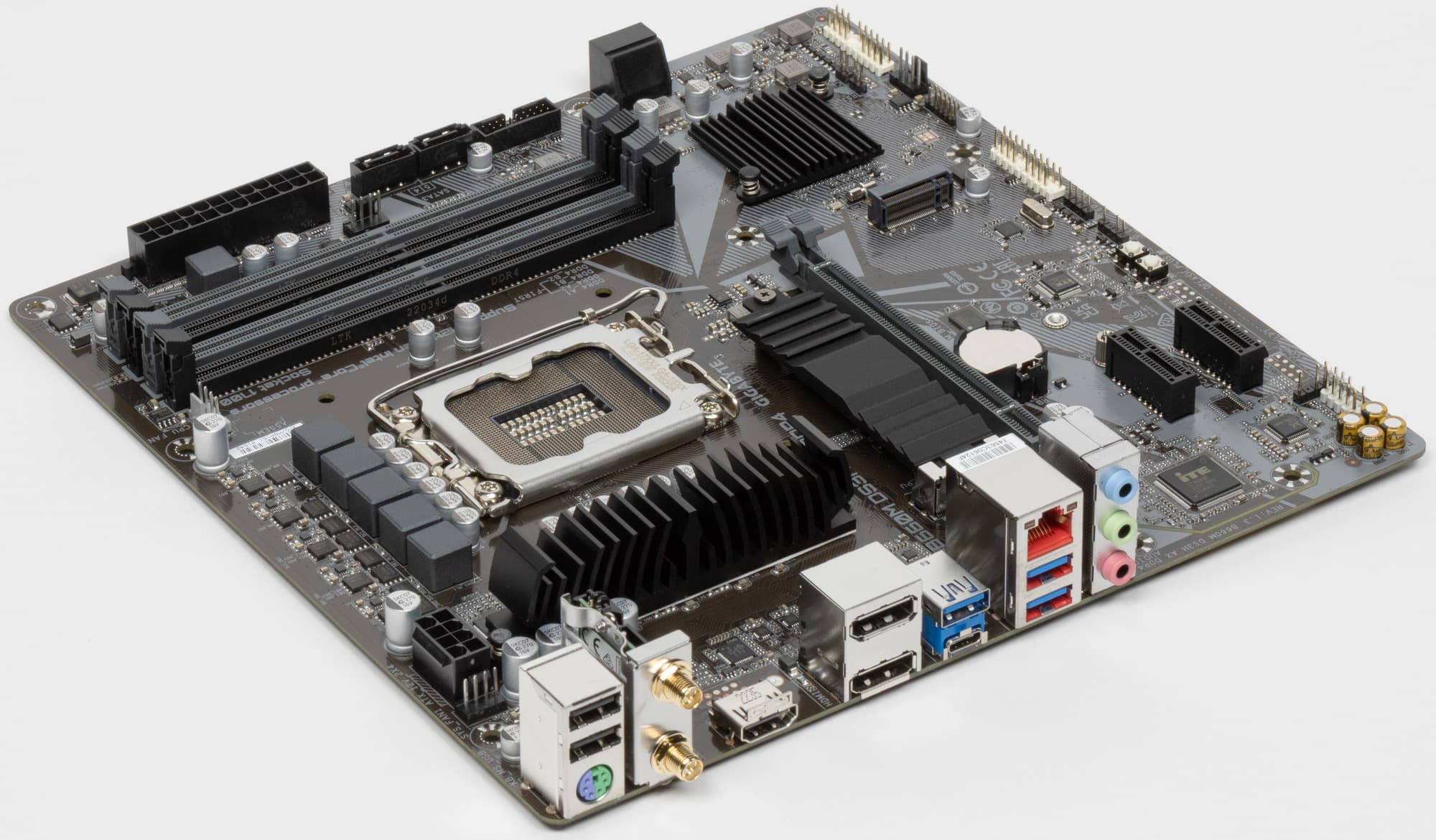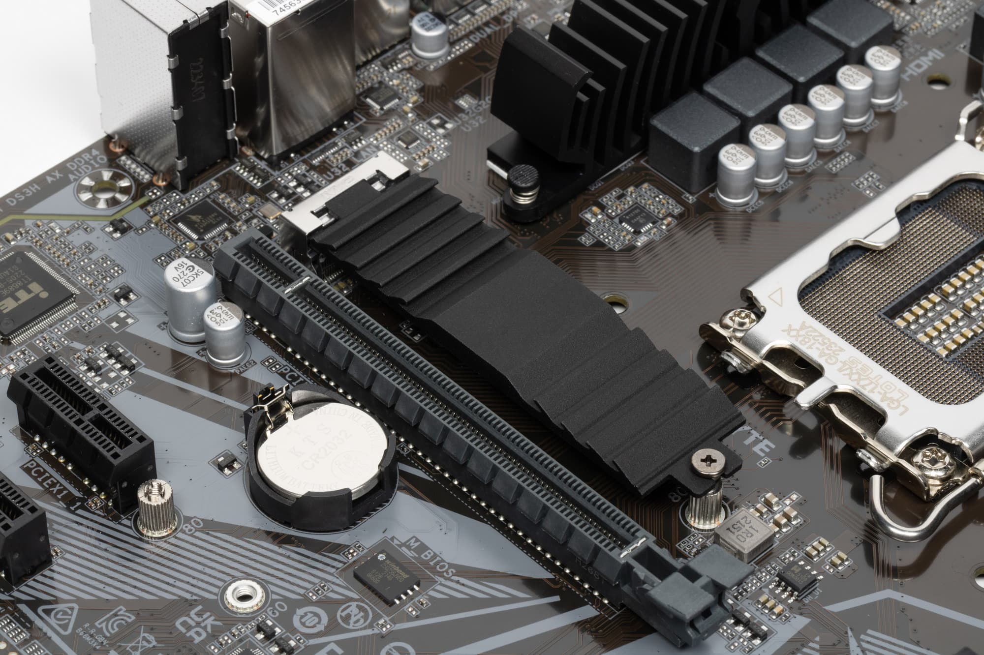 У платы есть 12 USB-портов, включая 1 очень быстрый USB 3.2 Gen2, а также 5 портов USB 3.2 Gen1. Единственный «длинный» слот для карт расширения — PCIe х16, который подключен к процессору 16 линиями PCIe 4.0. Есть и два слота PCIe 3.0 x1 (подключены к чипсету). Из 2 слотов M.2 один подключен напрямую к процессору, а другой — к B660, оба линиями PCIe 4.0. Второй слот M.2 без охлаждения. На компонентах VRM установлен только один радиатор на 4 фазы питания, остальные — без охлаждения, так что слишком мощный процессор здесь использовать нежелательно.