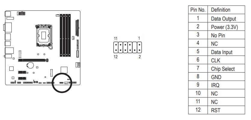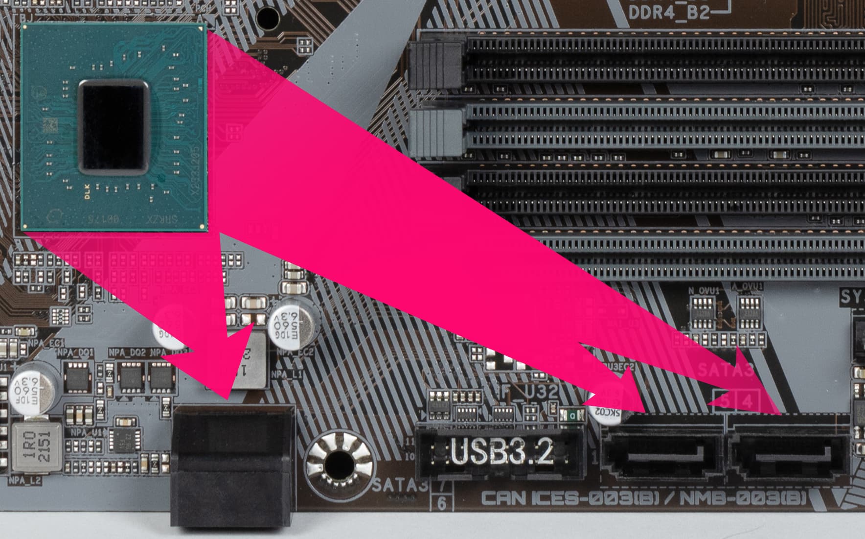 Процессоры Intel Core 12/13/14-го поколений (совместимые с сокетом LGA1700 и поддерживаемые B660) имеют 20 линий ввода-вывода (16 PCIe 5.0, 4 PCIe 4.0), не имеют USB и SATA портов. При этом взаимодействие с B660 идет по особому каналу Digital Media Interface 4.0 (DMI 4.0 x4 (именно х4!)). Все PCIe линии процессора идут на слоты расширения PCIe и порт М.2. Serial Peripheral Interface (SPI) используется для взаимодействия с системой UEFI/BIOS, а шина Low Pin Count (LPC) — для связи с устройствами ввода/вывода, не требующими высокой пропускной способности (контроллерами вентиляторов, TPM, старой периферии).