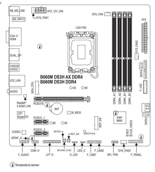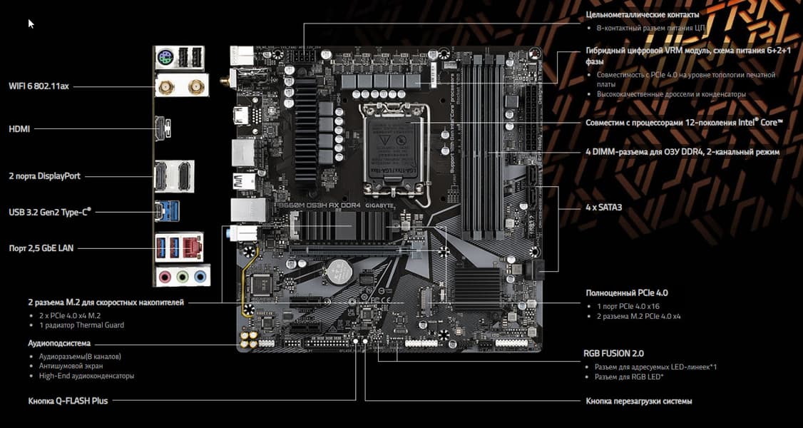 | Разъемы для накопителей | 4 × SATA 6 Гбит/с (B660) 1 × M.2 (M2A_CPU,CPU, PCIe 4.0 x4 для устройств формата 2260/2280) 1 × M.2 (M2P_SB,B660, PCIe 4.0 x4 для устройств формата 2260/2280) |