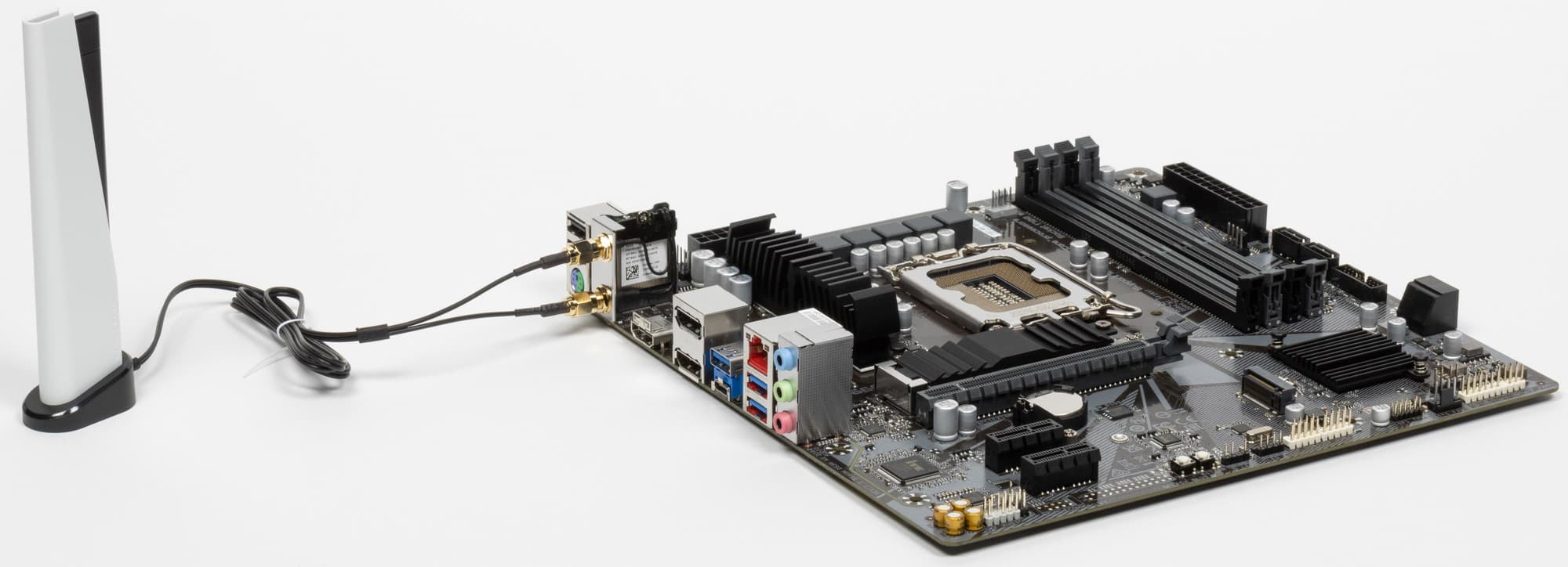 Имеется и комплексный беспроводной адаптер на контроллере MediaTek MT7921K (AMD RZ608), через который реализованы Wi-Fi 6 (802.11a/b/g/n/ac/ax) и Bluetooth 5.2. Он установлен в слот M.2 (E-key), и его разъемы для привинчивания выносных антенн выведены на заднюю панель.