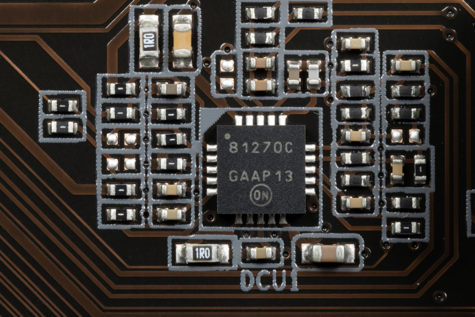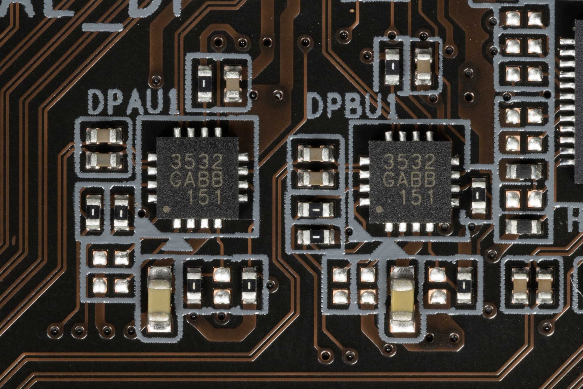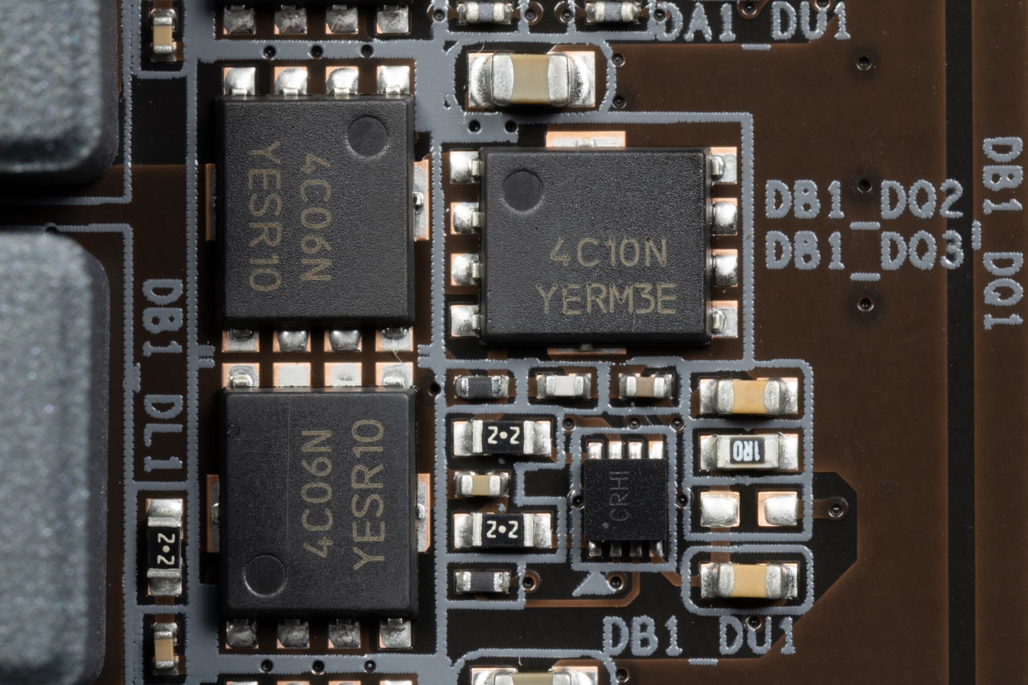 Каждый канал фазы для Vcore, iGPU, VCCSA и VCCIO имеет суперферритовый дроссель набор полевых МОП-транзисторов NTMFS4C06/4C10 от On Semi на 69A.
