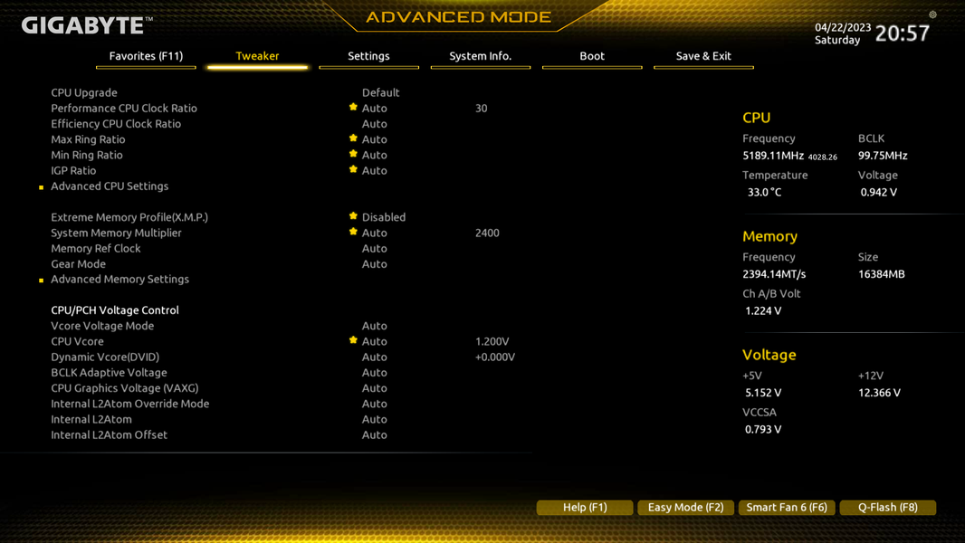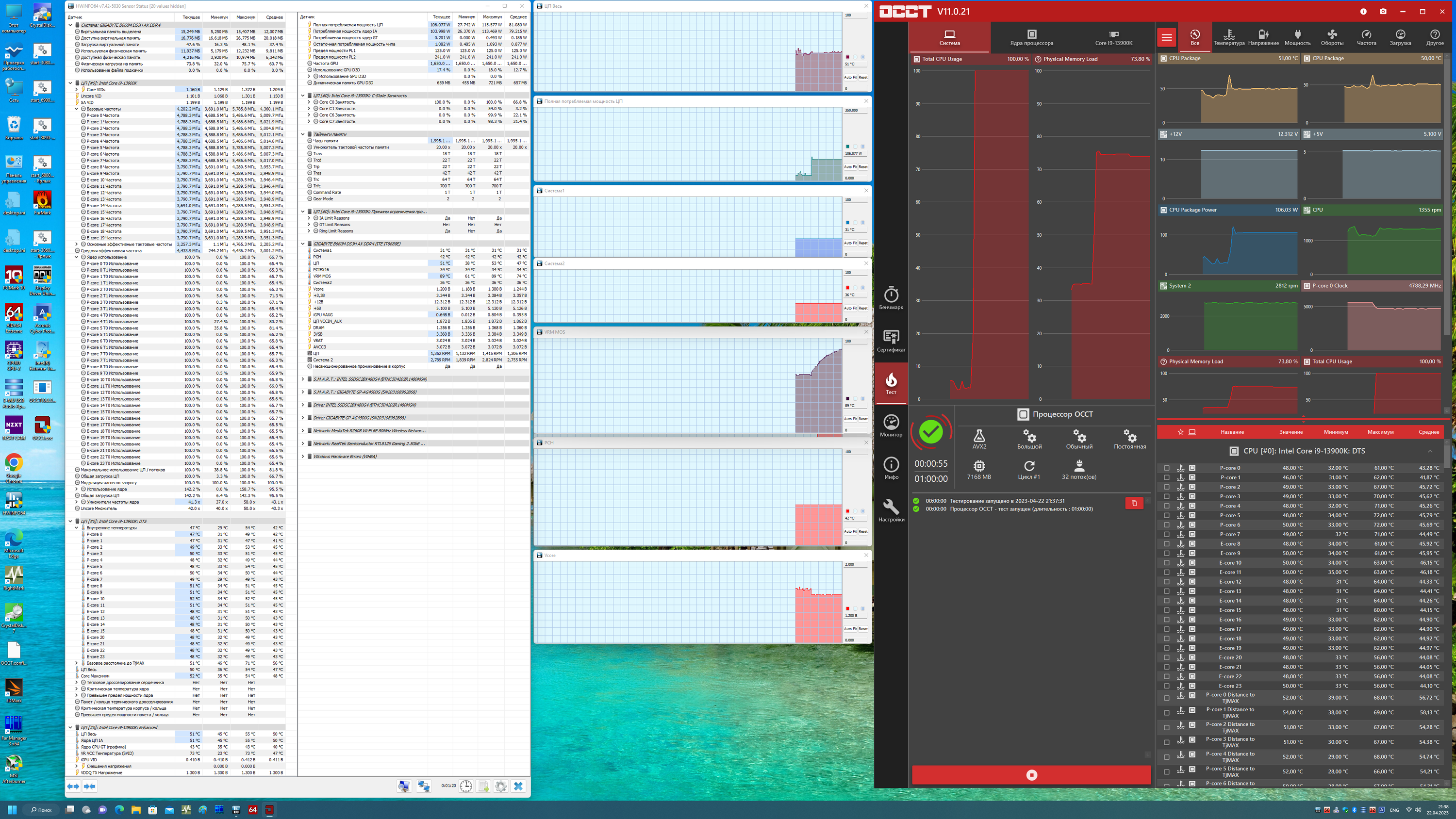 В режиме авторазгона мы получили 4.8 ГГц по всем P-ядрам, и 3.8 ГГц по всем Е-ядрам. Напомню, что Р-ядра — это обычные всем привычные ядра, имеющие по 2 потока каждый, «Р» — означает Performance, то есть производительные. «Е» — это энергоэффективные ядра, так называемые, малые ядра, у них по 1 потоку.