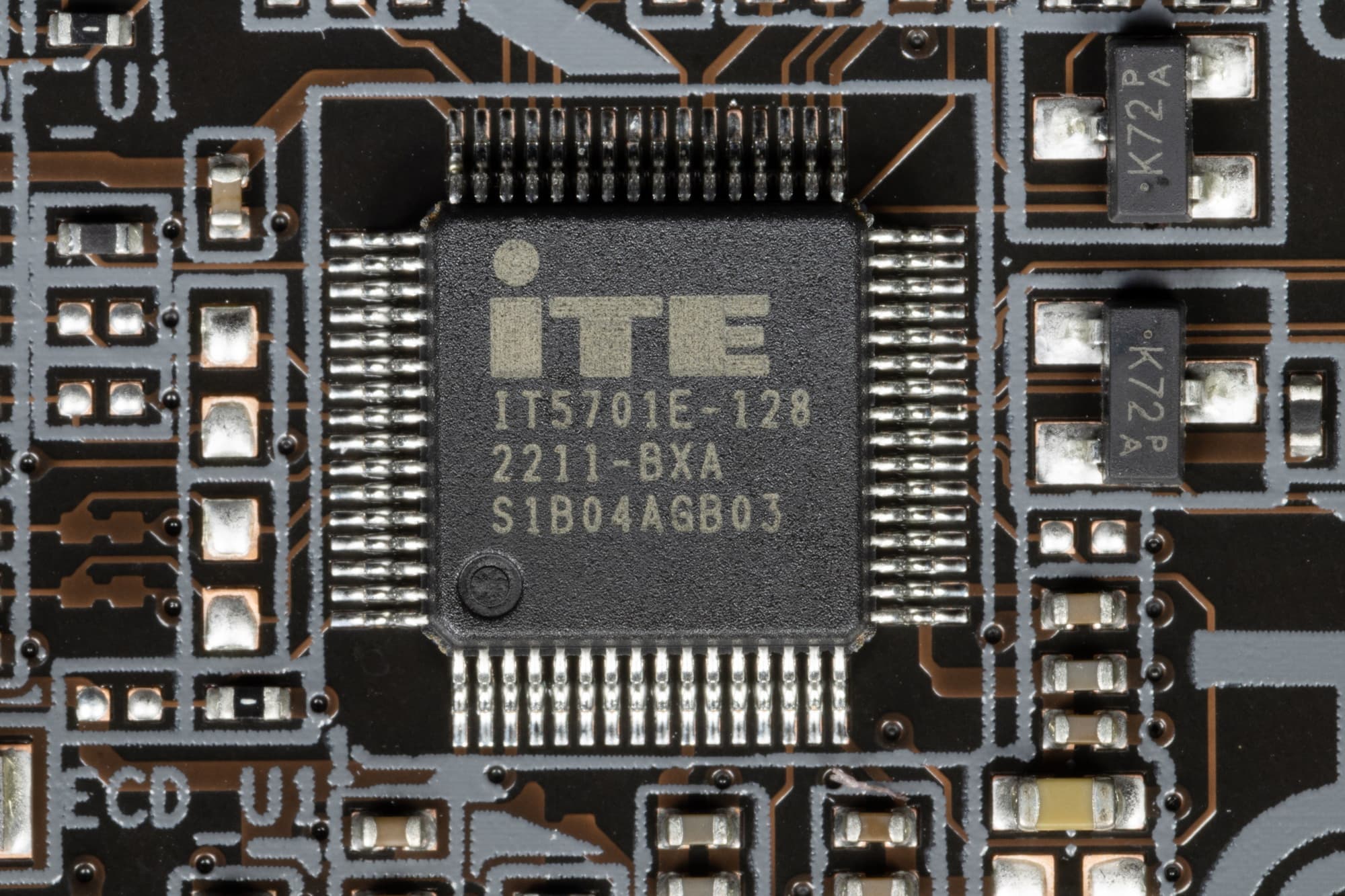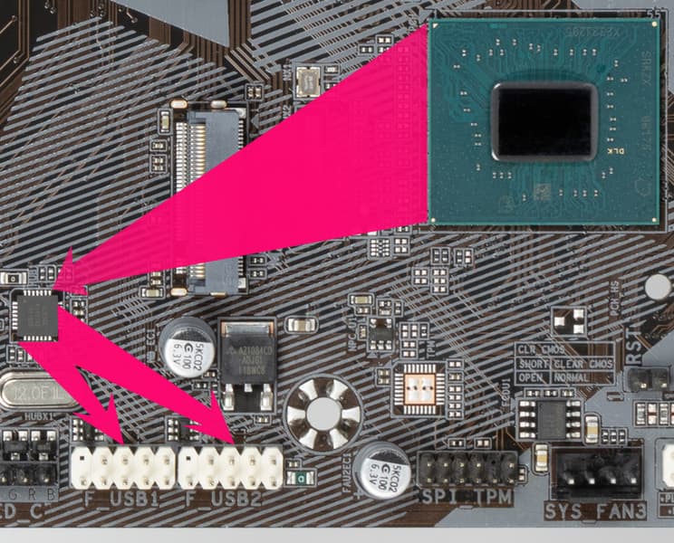 - 6 портов USB 2.0/1.1: 4 реализованы через хаб Genesys Logic GL850G (на него потрачена 1 линия USB 2.0 от B660) и представлены двумя внутренними разъемами на материнской плате (каждый на 2 порта); еще 2 реализованы через B660 и представлены 2 портами Type-A (черного цвета) на задней панели.