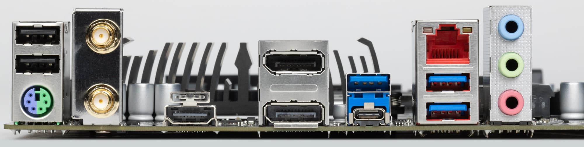 | Разъемы на задней панели | 3 × USB 3.2 Gen1 (Type-A) 1 × USB 3.2 Gen2 (Type-C) 2 × USB 2.0 (Type-A) 1 × RJ-45 3 аудиоразъема типа миниджек 2 антенных разъема 1 разъем HDMI 2.1 out 2 разъема Display Port 1.4 out 1 универсальный разъем PS/2 |