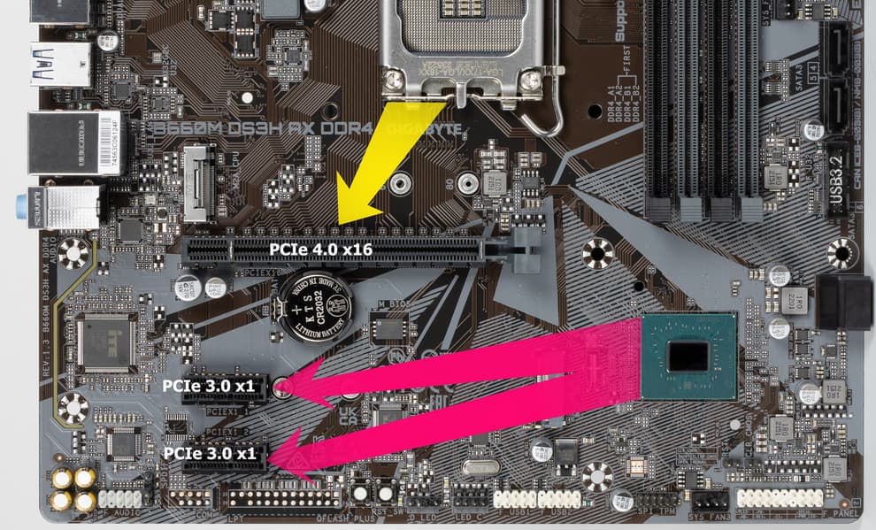 Кроме USB-портов, к которым мы подойдем позже, чипсет B660 обладает 14 PCIe линиями и 4 портами SATA. Считаем, сколько линий уходит на поддержку (связь) с тем или иным элементом (надо учитывать, что 14 линий не единой версии, а 6 линий PCIe 4.0 и 8 линий PCIe 3.0):