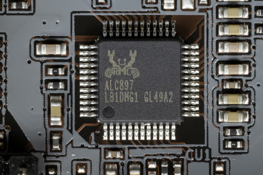 На данной матплате звуком заведует уже очень старый аудиокодек Realtek ALC897. Он обеспечивает вывод звука по схемам до 7.1 с разрешением до 24 бит / 192 кГц.