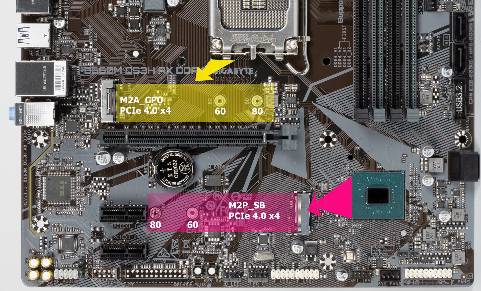 Второй M.2 (M2P_SB) получает данные от чипсета B660 (PCIe 4.0), а первый M.2 (M2A_CPU) получает данные от CPU (PCIe 4.0), и оба поддерживают модули только с интерфейсом PCIe.