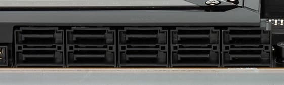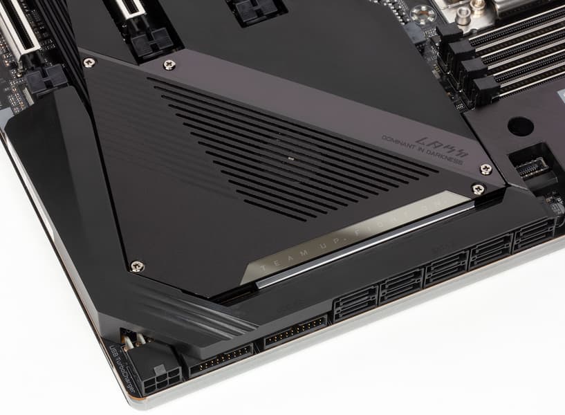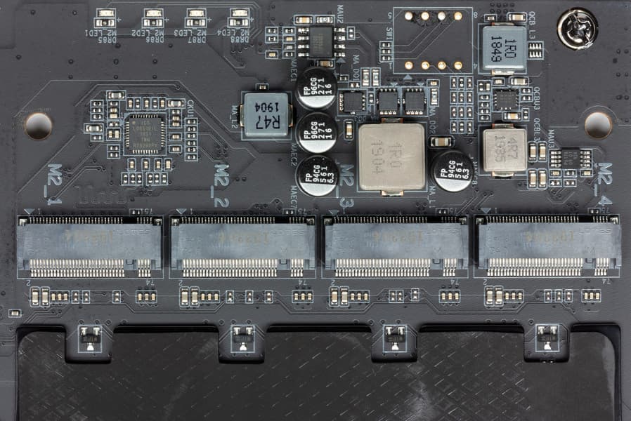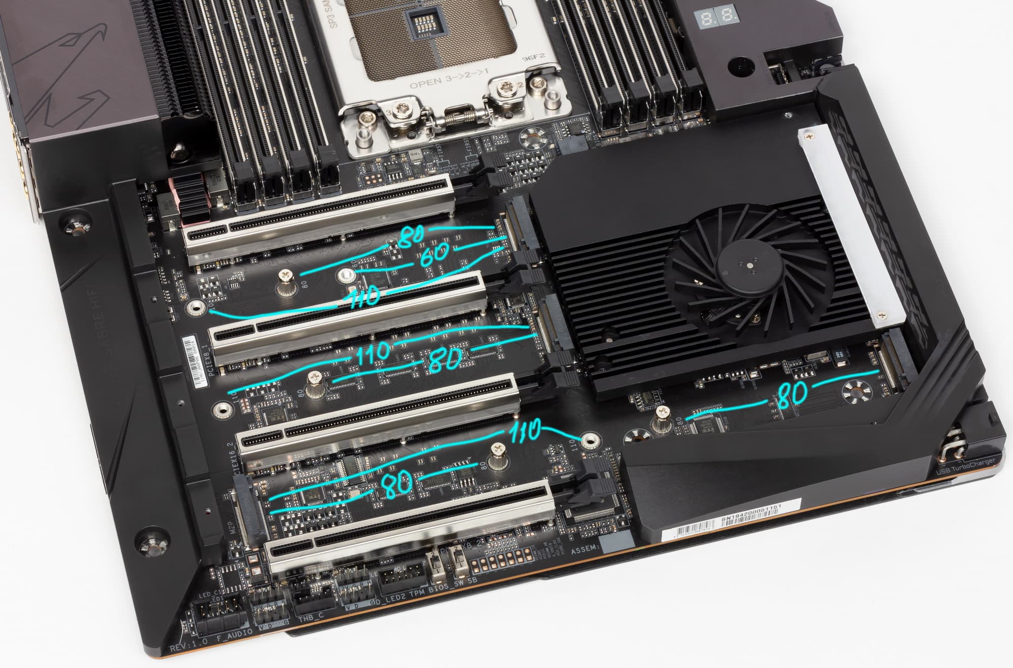 Всего у платы 10 разъемов Serial ATA 6 Гбит/с + 4 слота для накопителей в форм-факторе M.2. (Еще один слот M.2, спрятанный под кожухом блока разъемов задней панели, занят контроллером беспроводных сетей Wi-Fi/Bluetooth.). 8 портов SATA реализованы через чипсет TRX40 (4 порта — штатным набором плюс 4 порта — из свободных PCI-E линий, при этом есть деление ресурсов с одним слотом M.2 — об этом ниже).