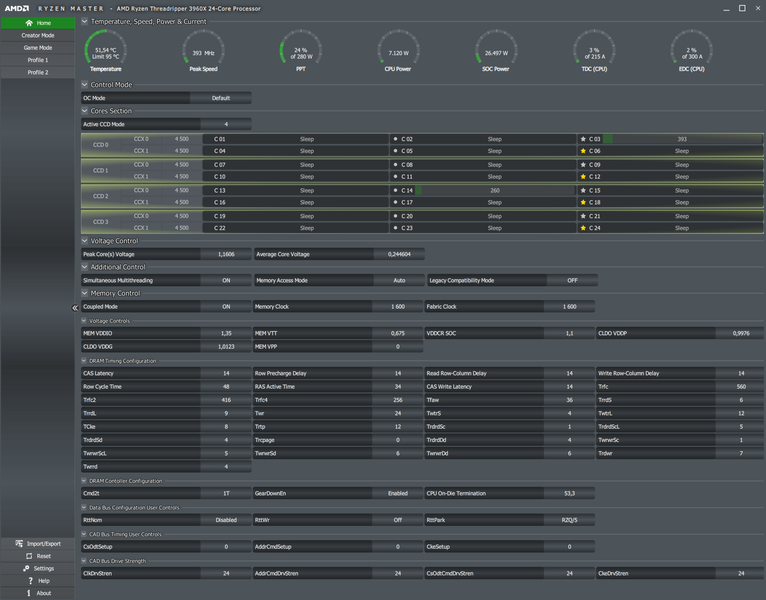 Ryzen Master предлагает два основных режима использования процессора, и в зависимости от них выставляет нужные параметры работы CPU: Creator Mode и Game Mode. Желающие экспериментов могут создать свои профили и пресеты.