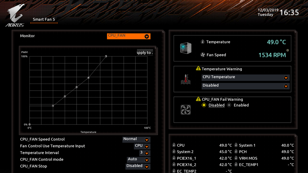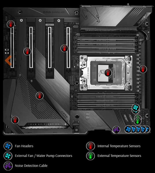 Также Gigabyte TRX40 Aorus Xtreme обладает целой россыпью термодатчиков. Управление всем этим богатством возложено на утилиту SmartFan 5.0, а также реализовано управление в настройках UEFI/BIOS.