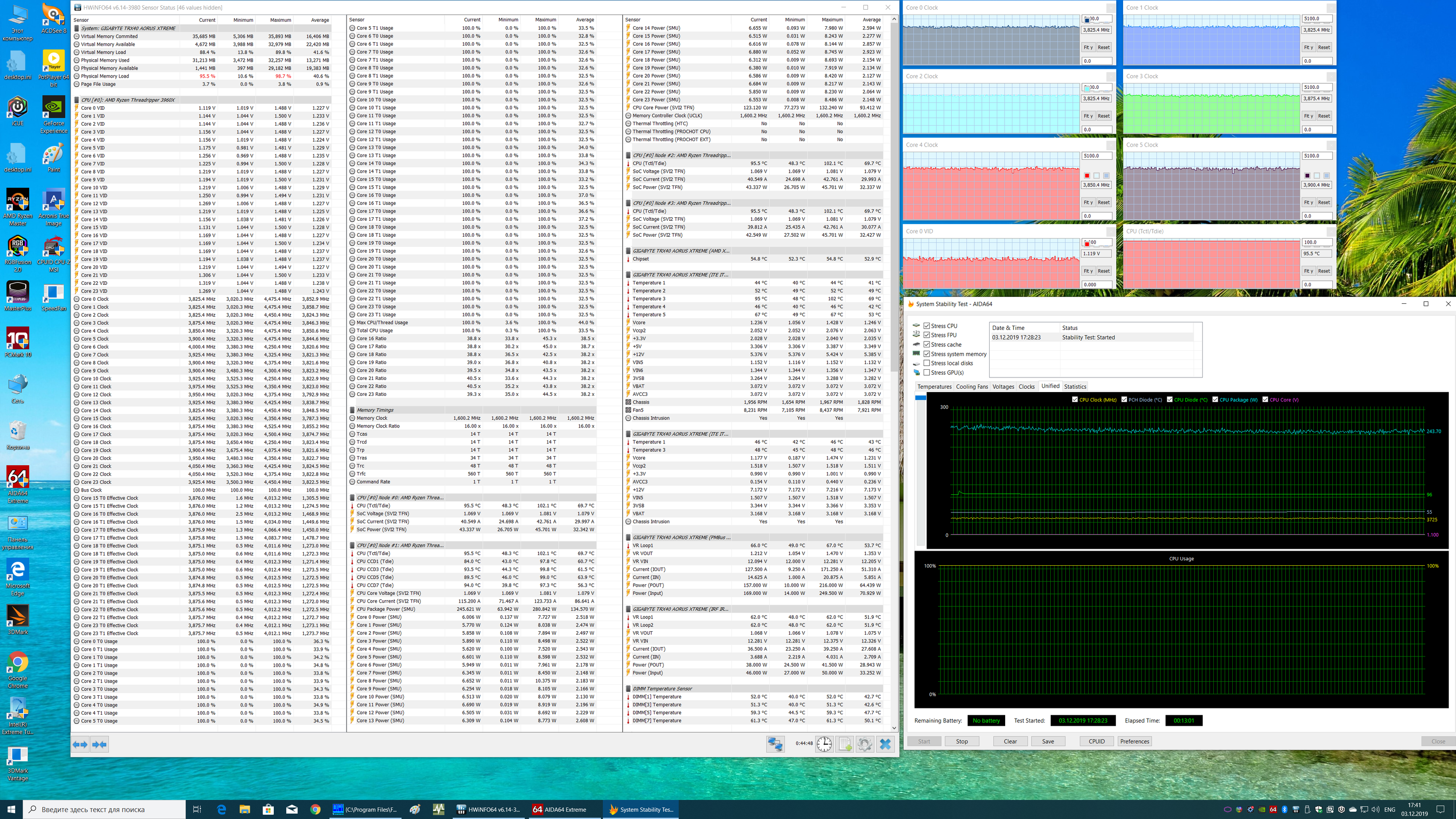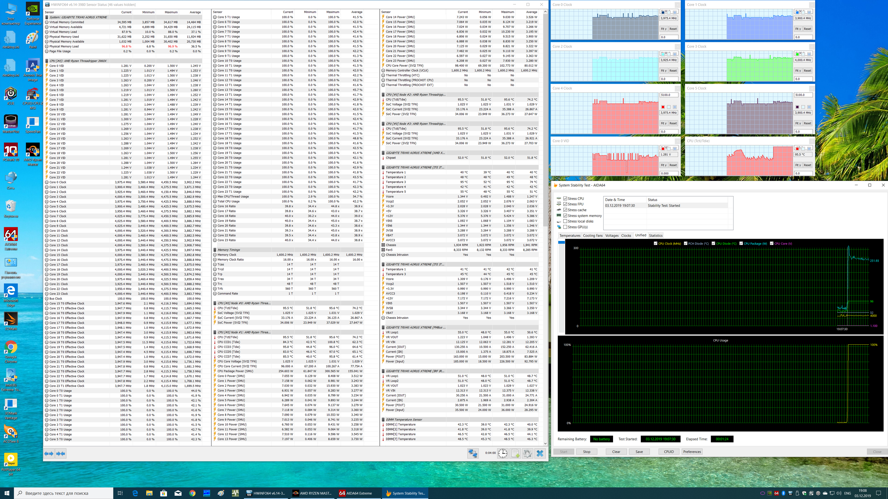 Запуск очередного жесткого теста AIDA подтвердил это предположение: очень быстро AMD Precision Boost2 сбросил частоты работы процессора, ибо он все равно перегревался.