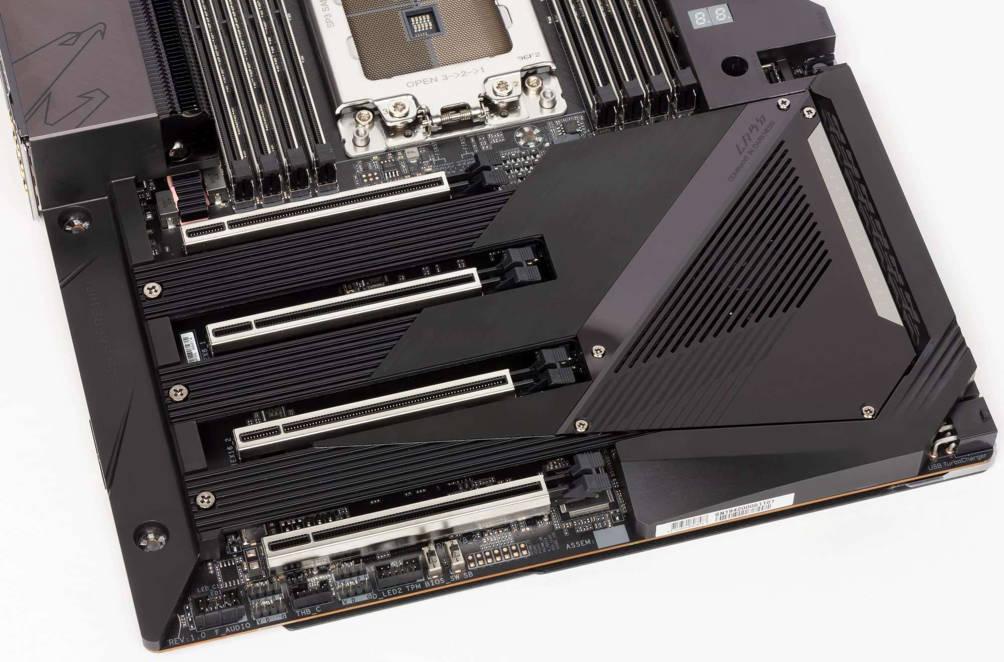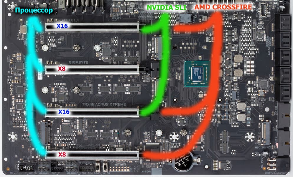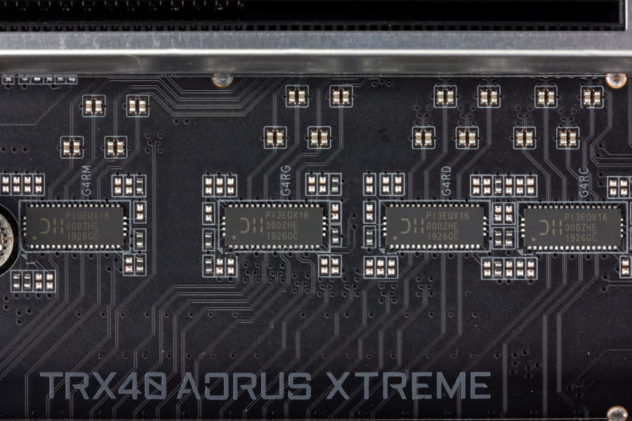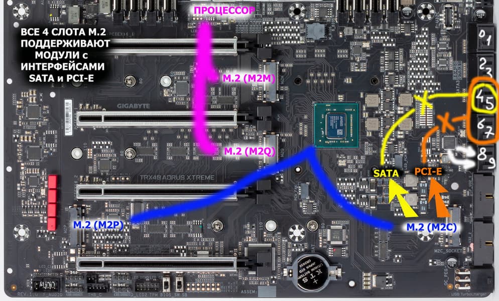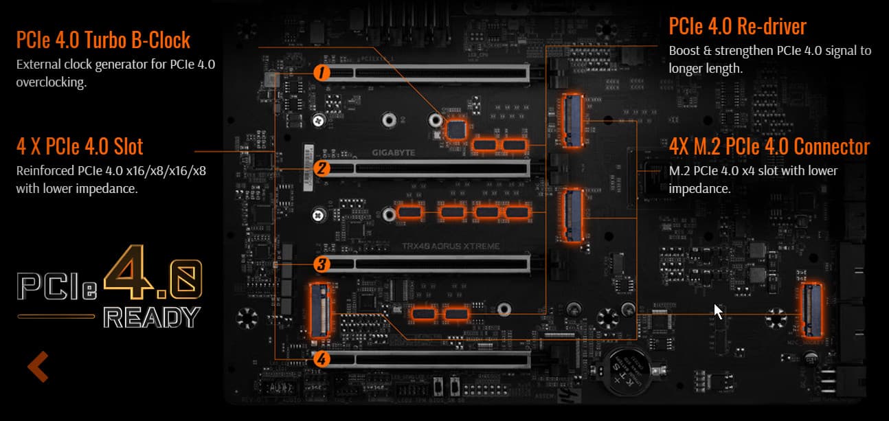 А теперь пойдем по той самой периферии, которая и «пожирает» те самые ресурсы. Начнем со слотов PCI-Eх16, их «кормит» не чипсет TRX40, а процессор.