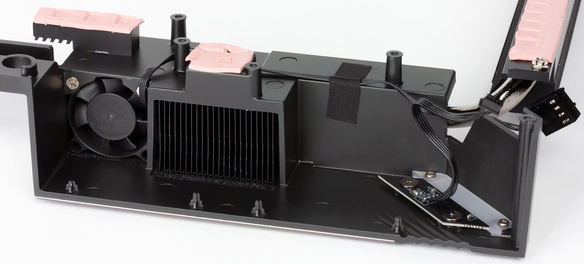 Для модулей M.2, как я уже выше отмечал, есть свои три радиатора с термоинтерфейсами. Они крепятся к большому чипсетному радиатору и также принимают участие в общей схеме охлаждения.