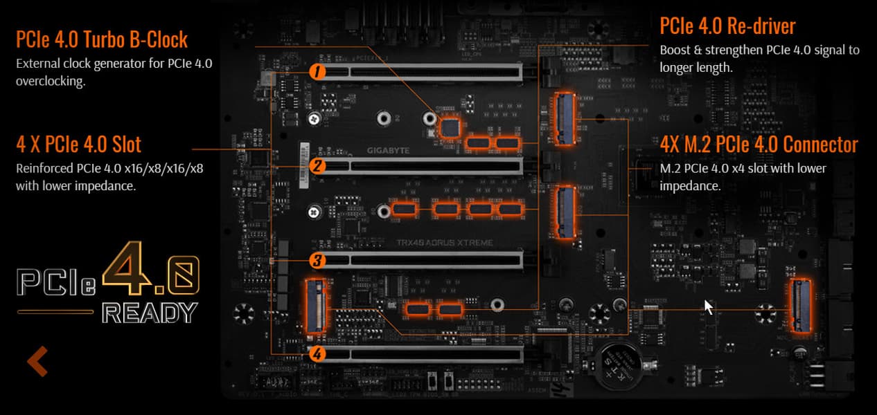 Но моя задача акцентировать внимание на том, что спутником новой линейки Threadripper 3xxx стал чипсет TRX40. Понятно, почему потребовался новый чипсет (в отличие от Intel, где выпуск новых Core i9-10xxxX не потребовал производства нового чипсета, со всем по-прежнему справляется X299): поддержка новой версии шины PCI-E 4.0 в целом и резкое увеличение (в 4 раза) скорости обмена данными по внутренней шине «процессор-чипсет». Плюс заодно некоторое внесение в изменение дизайна.