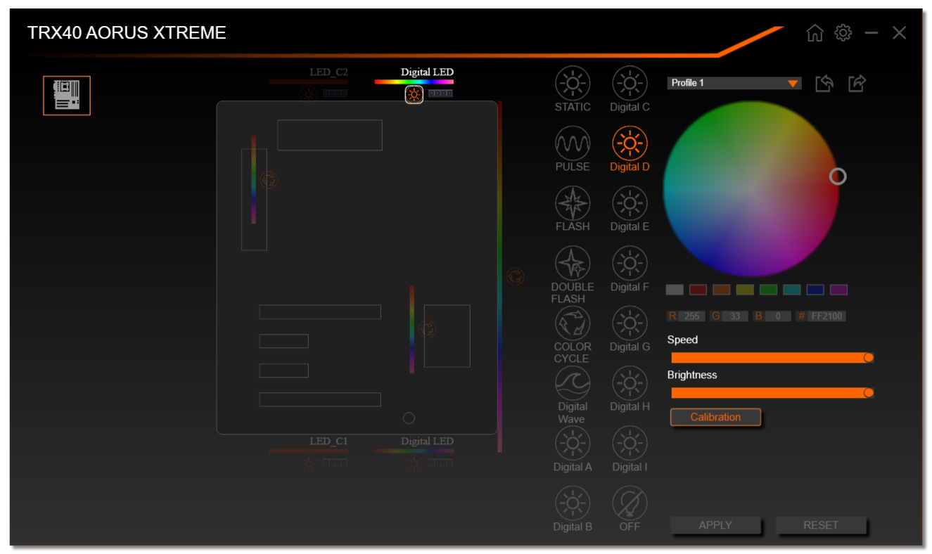 Топовые платы Aorus всегда отличаются очень красивой подсветкой. Обычно светодиоды образуют яркие эффекты на кожухе, покрывающем задний блок с разъемами, а также подсвечены радиатор чипсета и кожух над блоком аудио. Однако в данном случае разработчики как-то явно поскупились: на кожухе (по сути радиаторе) кроме скромной надписи «Aorus» подсветки нет (не считая еще табло с POST-кодами), также нет подсветки и над аудиоблоком. И только чипсетный радиатор вместе с боковой полосой, идущей вдоль правой стороны платы, создают некий красочный эффект. Подчеркивание позиционирования HEDT? — Но у тех же топовых плат на Intel X299 с подсветкой все намного богаче. Тем не менее, мы помним про 4 разъема для подключения внешней подсветки, и всем этим можно управлять через программу RGB Fusion.