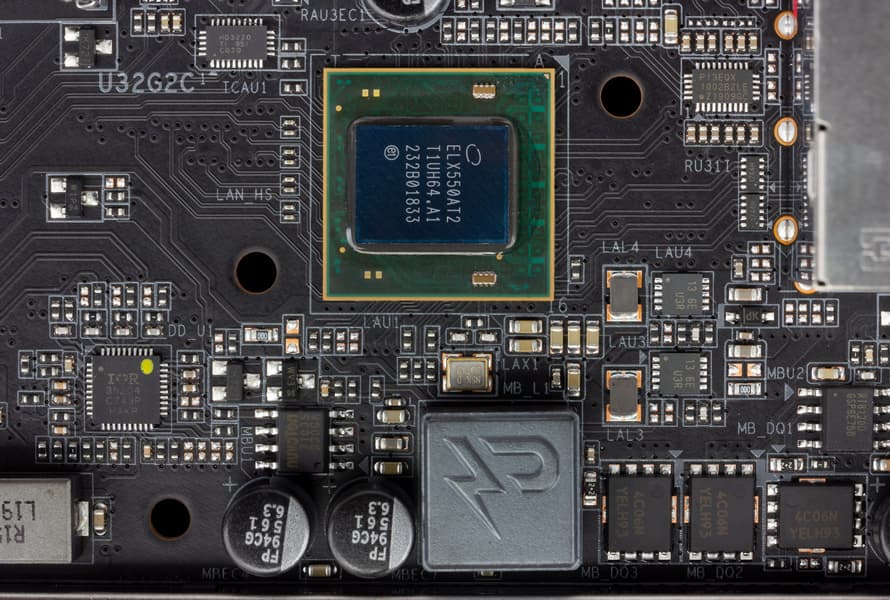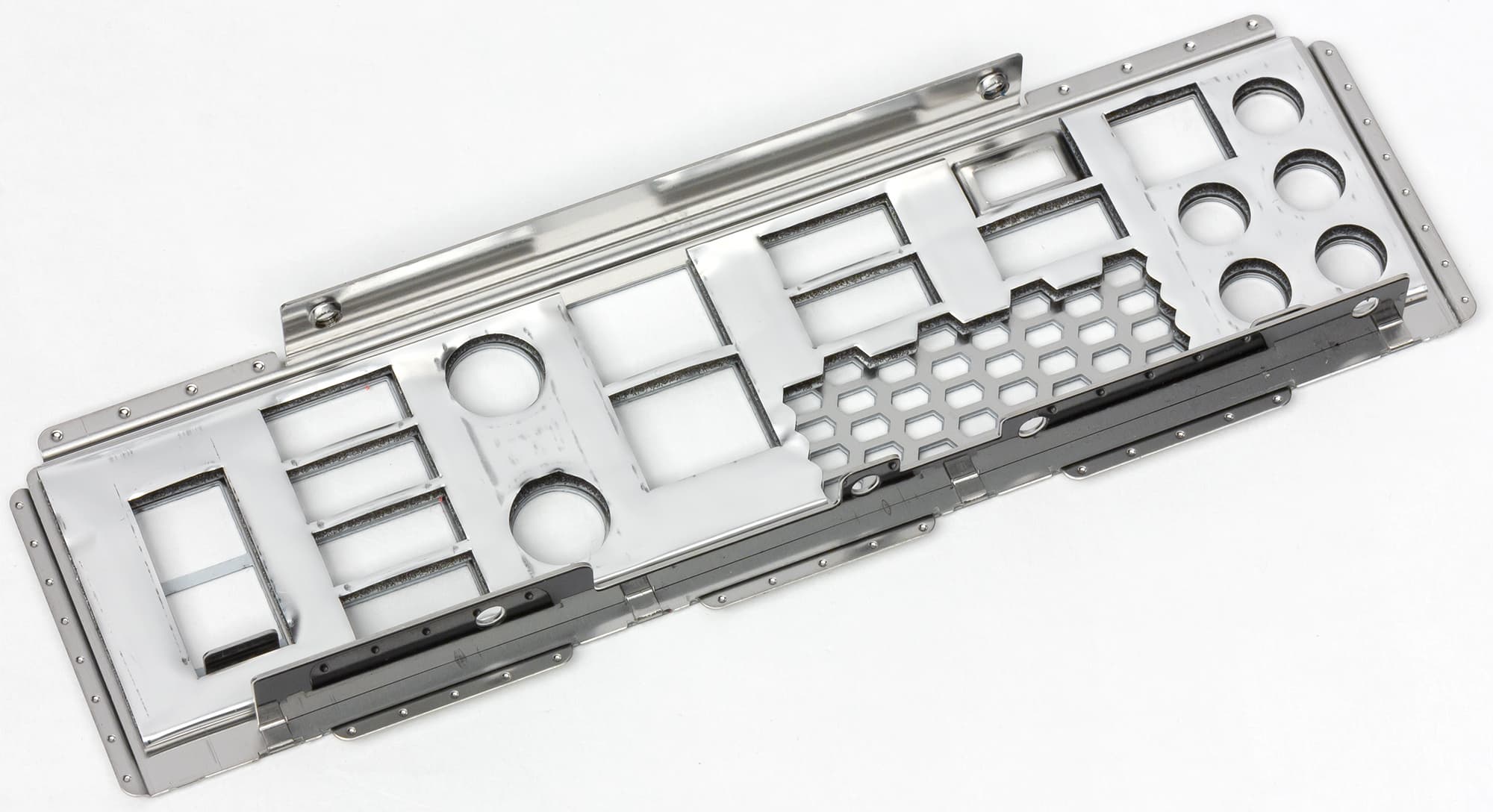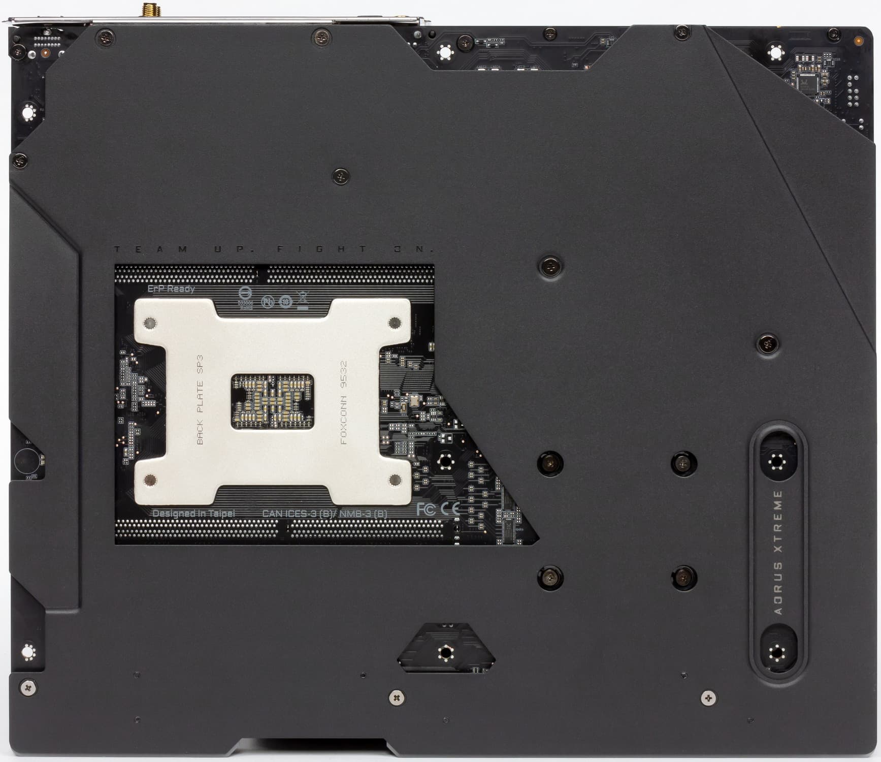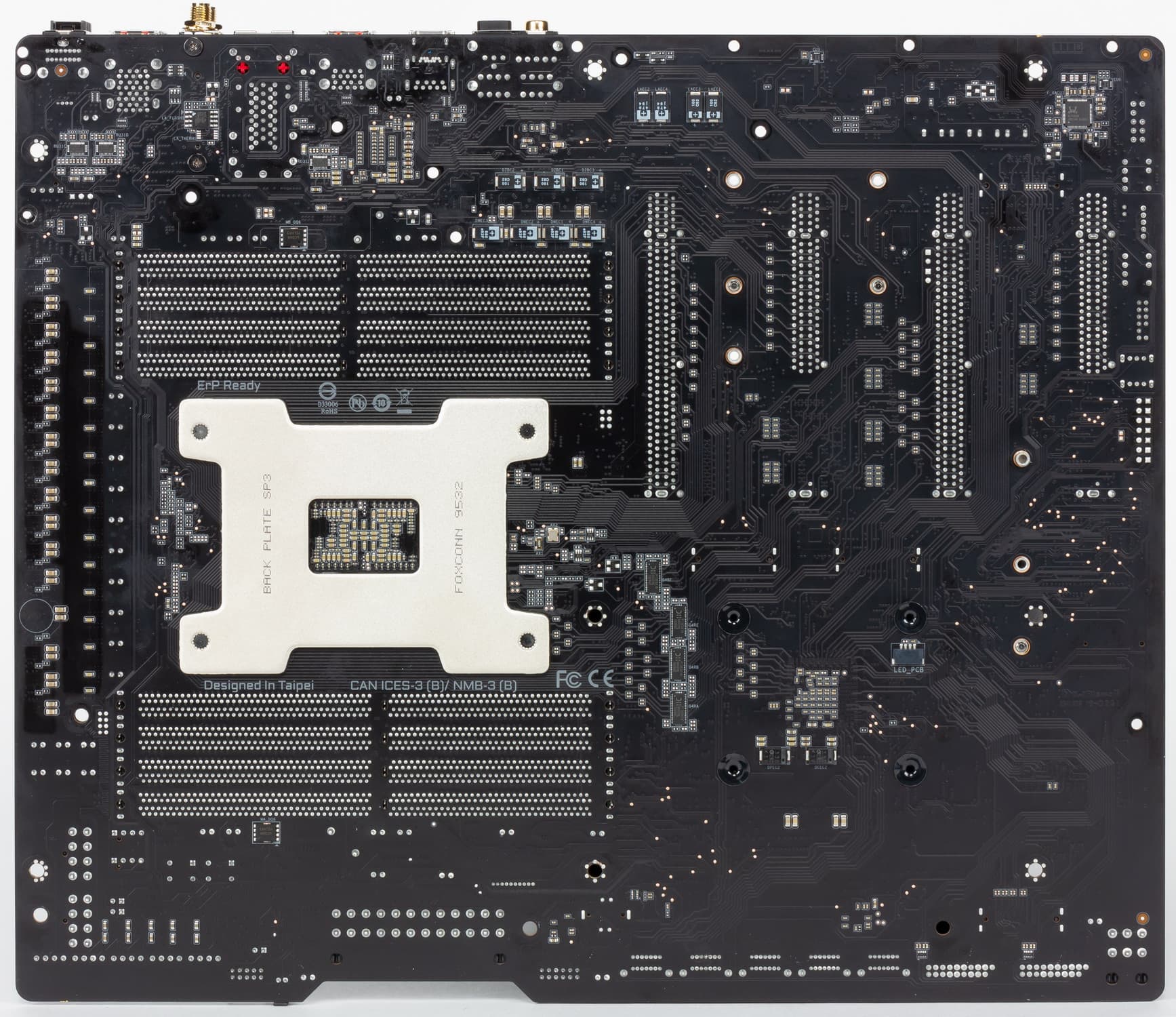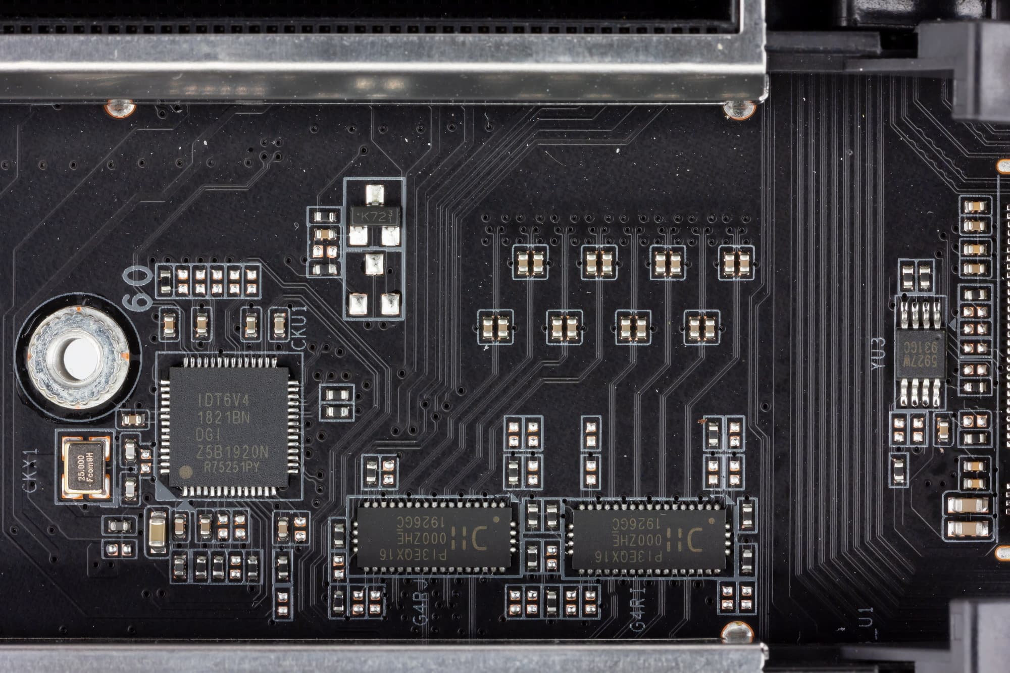 На оборотной стороне элементы имеются, в частности, ряд усилителей сигнала для шины PCI-E, и другая мелкая логика. Обработан текстолит очень хорошо: во всех точках пайки не только острые концы срезаны, но и все гладко отшлифовано. С той же стороны установлена пластина из алюминия с нанокарбоновым покрытием для предотвращения замыкания электроконтактов на PCB. Также пластина помогает отводить тепло от задней стороны PCB через термоинтерфейс и обеспечивает жесткость материнской платы. И даже сняв эту пластину, приятно взять в руки такой текстолит.
