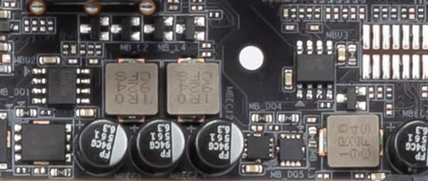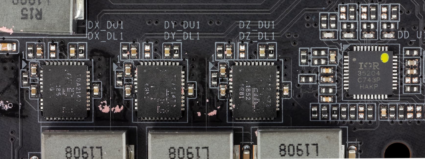 Каждый канал фазы имеет суперферритовую катушку и MOSFET IR TDA21472 на 70 A того же Infineon.