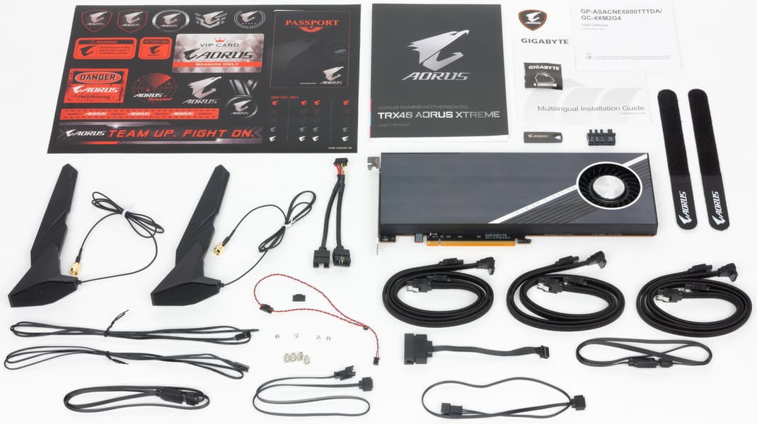 В комплекте поставки, кроме традиционных элементов типа руководства пользователя и кабелей SATA (что уже много лет является обязательным набором ко всем материнкам), есть выносные антенны с подставками для беспроводных соединений, разветвители для подключения подсветок, винтики для монтажа модулей M.2, фирменный адаптер G-Connector (о нем позже), адаптер-удлинитель для передней панели, провода с термодатчиками, адаптер внутренних портов USB 2.0, Aorus Gen4 AIC Adaptor (о нем также позже), накопитель типа USB Flash drive, бонусные стикеры, стяжки и наклейки.