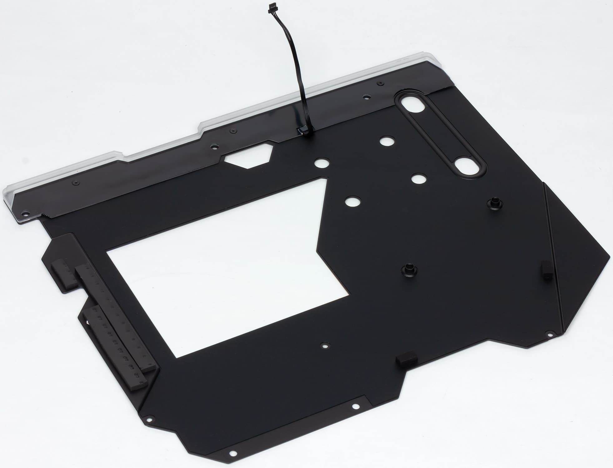 Над аудиоподсистемой и правой стороной платы установлены пластиковые кожухи соответствующего дизайна и с подсветкой, привычного кожуха над блоком разъемов задней панели нет, ибо его место занял радиатор.