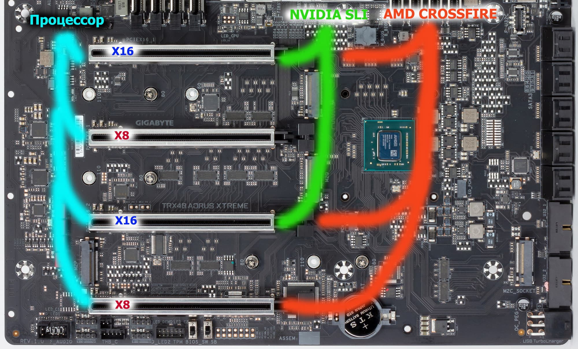 Итак, сам Ryzen Threadripper 3ххх обладает 64 линиями PCI-E 4.0, которых 8 всегда используются для связи процессора с чипсетом (остается свободных — 56).