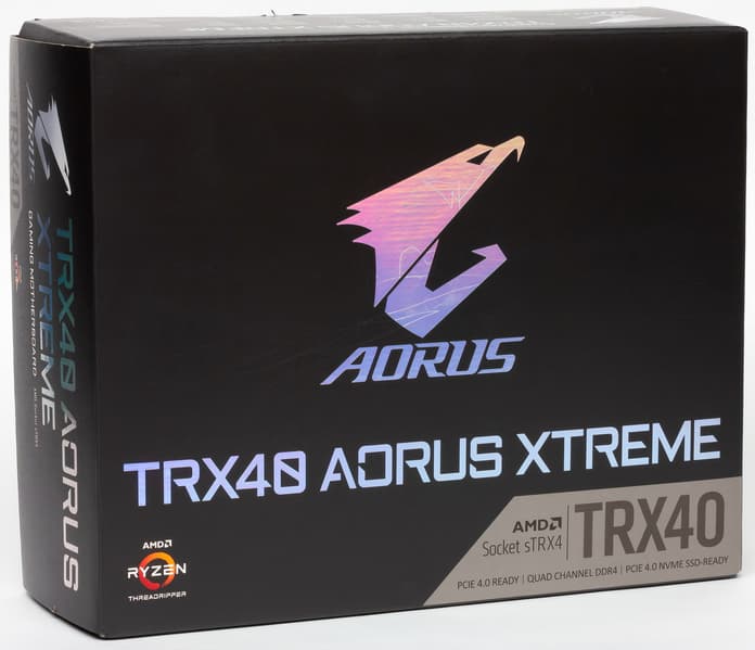 Gigabyte TRX40 Aorus Xtreme поставляется в большой и толстой коробке с красочным лого Aorus.