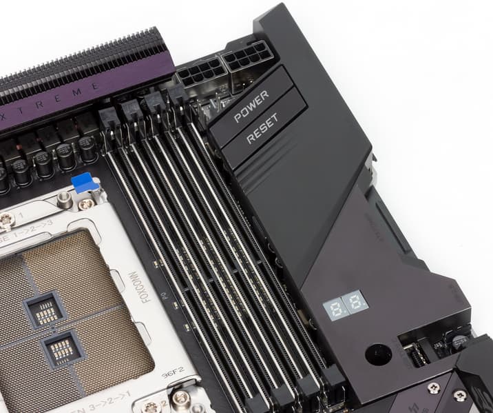 Слоты PCI-E и для модулей памяти армированы, для накопителей во всех размещенных на плате слотах M.2 предусмотрено хорошее охлаждение. Великолепно спроектирована система питания, способная обеспечить работу любых совместимых процессоров под серьезным авторазгоном (через Precision Boost 2). В системе питания процессора 16 честных фаз для ядер и 3 фазы для SoC. Также надо упомянуть наличие двух очень быстрых (10 Гбит/с) Ethernet-портов. Имеется два порта USB Type-C (один из них — внутренний, надо иметь корпус с выведенным USB Type-C). Для разгона плата подходит превосходно (плюс у нее много разнообразных настроек), однако разгон, скорее всего, упрется в возможности самих новых Ryzen Threadripper, а также потребует очень мощных СО (для их вентиляторов на плате предусмотрено 7 разъемов). Еще в плюсы надо добавить красивую подсветку самой платы и широкие возможности для подключения дополнительных RGB-устройств.