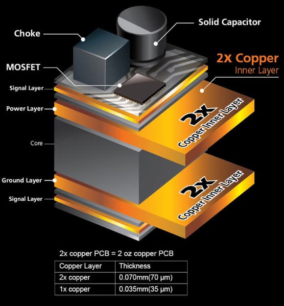 Стоит напомнить, что платы Gigabyte премиального уровня имеют удвоенные по толщине медные слои в разводке питания, что помогает более эффективному теплоотводу.