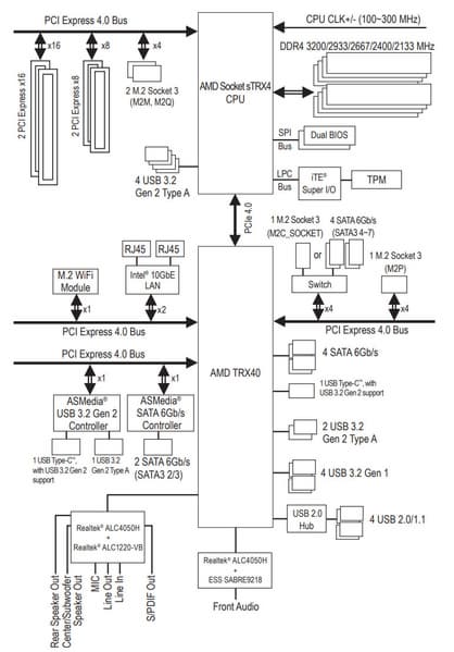 Помимо вышесказанного TRX40 поддерживает до 8 портов USB 3.2 Gen2, до 4 портов USB 2.0, и до 4 портов SATA.