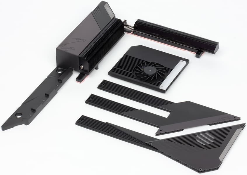 Все потенциально сильно греющиеся элементы имеют свои собственные радиаторы. Как известно, самым горячим звеном в наборе AMD TRX40 является сам чипсет, поэтому многие производители вынуждены вспомнить про вентиляторы для такого рода микросхем.